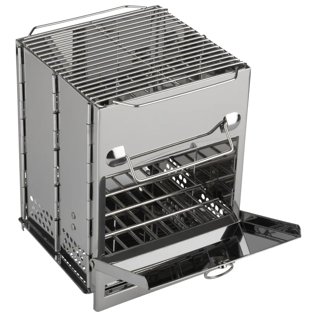 Our fireplaces and grills are designed to work as a complete outdoor cooking system. Each component packs flat for easy transport, whether you're heading out car camping or grilling in the backyard. The modular setup lets you quickly combine the fireplace and grill for cooking, heating, or just enjoying the fire. The grill height is adjustable for precise heat control. Also, the grill net can be removed—perfect for barbecuing meat on a stick or switching up your cooking style.