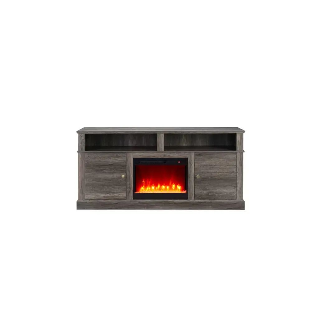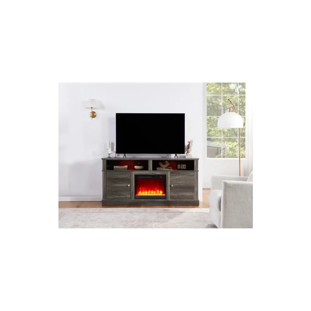 Heater with 11 Temperature Settings7 Flame Color OptionsTimer Included2 Cabinets with 1 Shelf within2 Open Shelves with LED Light.Set the mood with the mesmerizing flame color options, ranging from vibrant oranges to calming blues. Choose the perfect ambiance to complement any occasion or décor style. Organize your media essentials with ease thanks to two cabinets, each equipped with a shelf within.