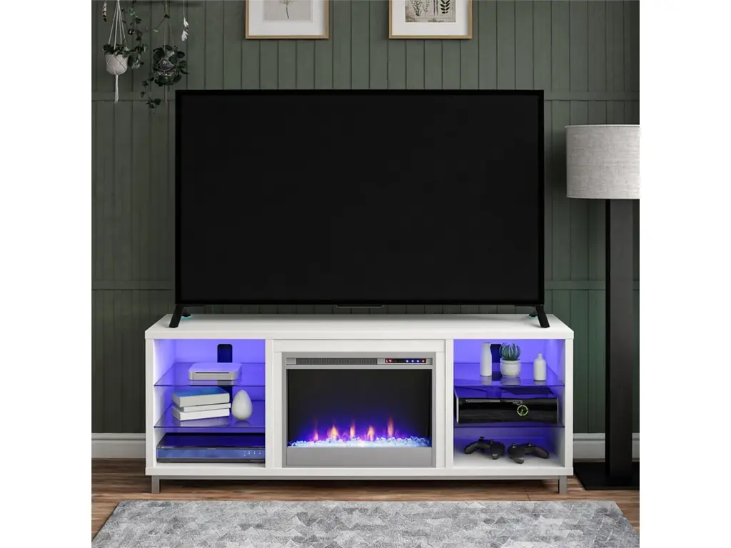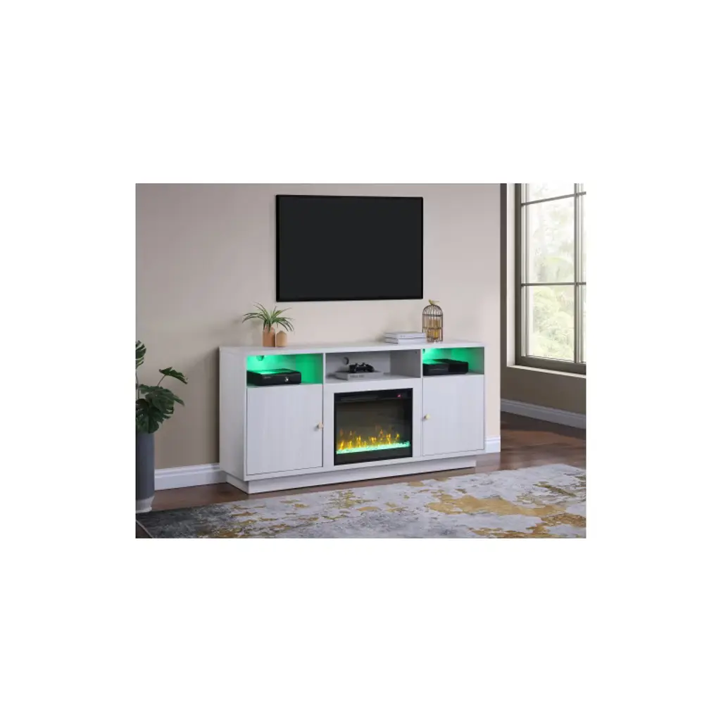 Heater with 11 Temperature Settings7 Flame Color OptionsTimer Included2 Cabinets with 1 Shelf Inside with LED Light. Set the mood with the mesmerizing flame color options, ranging from vibrant oranges to calming blues. Choose the perfect ambiance to complement any occasion or décor style. Organize your media essentials with ease thanks to two cabinets, each equipped with a shelf within.