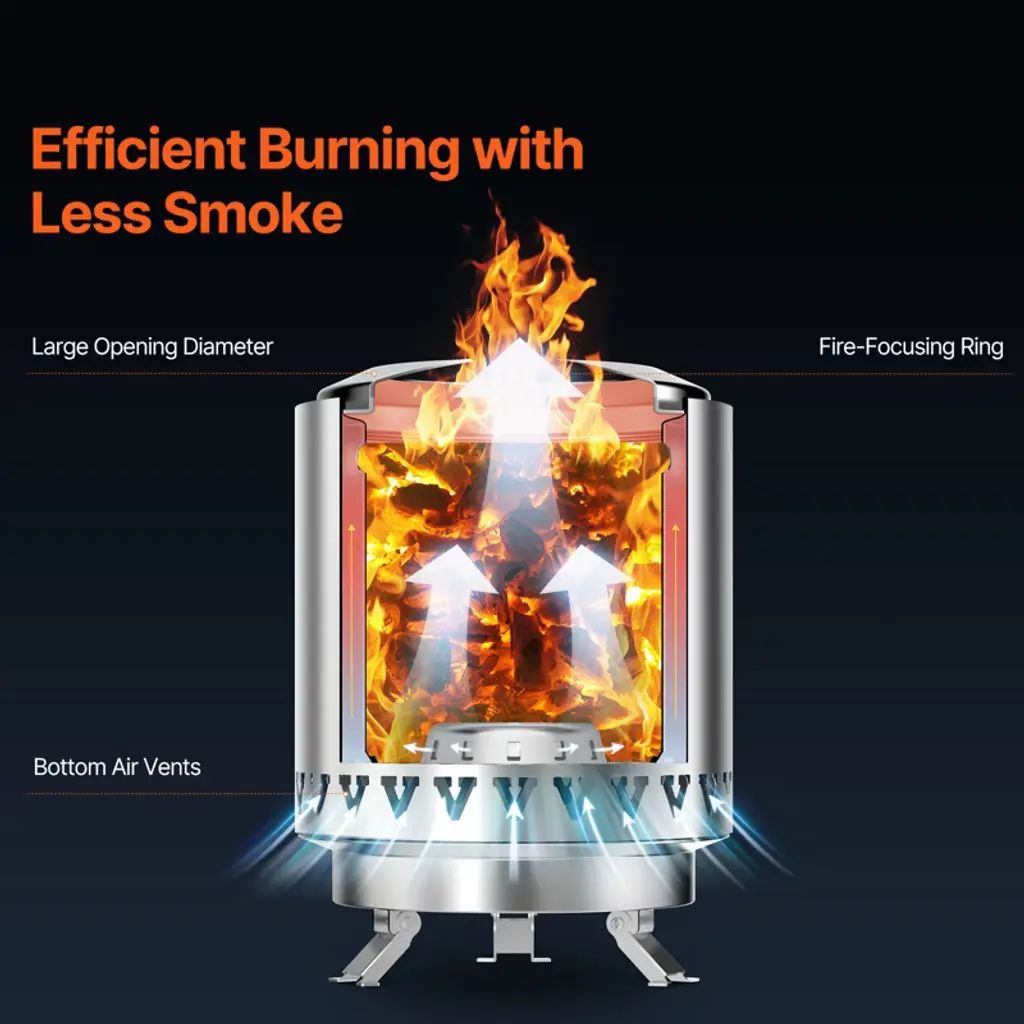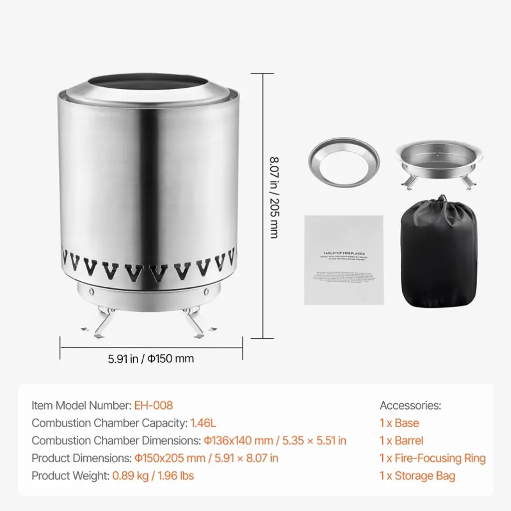 Feature: Smokeless Fireplace: The Φ5.35 in opening and Φ3.94 in fire ring design ensure complete combustion, while the optimized air vent system effectively reduces smoke emissions, providing a low-carbon and green experience. 30-Minute Continuous Burn: The 1.46L combustion chamber supports wood blocks or pellets as fuel, allowing for long-lasting burns and reducing the need for frequent refueling. Stable Design: The tabletop fire pit features a stable design with a low center of gravity to ensure stability during use. Whether placed on a tabletop or the ground, you can use it with confidence. The stainless steel barrel ensures durability and corrosion resistance, while the upgraded removable base makes cleaning easy. Compact and Lightweight: With a compact design of Φ5.91 in x 8.35 in (15 cm x 21.2 cm) and weighing just 1.96 lbs (0.89 kg), this table top fire pit comes with a storage bag for easy carrying, making it perfect for outdoor use. Outdoor Entertainment Companion: Ideal for camping and patio gatherings, this fire pit tabletop provides warmth and enhances the atmosphere, making every outdoor moment cozy and lively. Package Content 1 x Base 1 x Barrel 1 x Fire-Focusing Ring 1 x Storage Bag