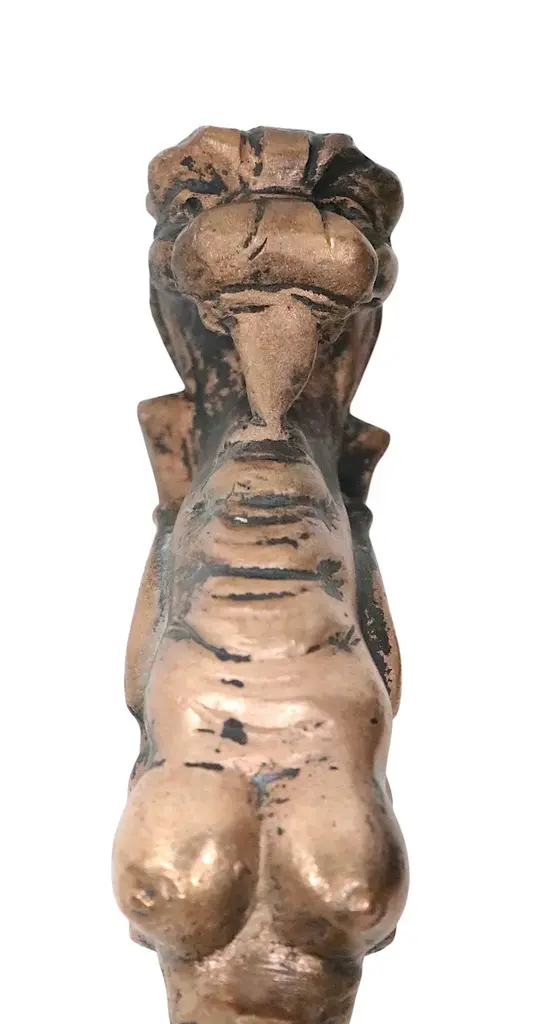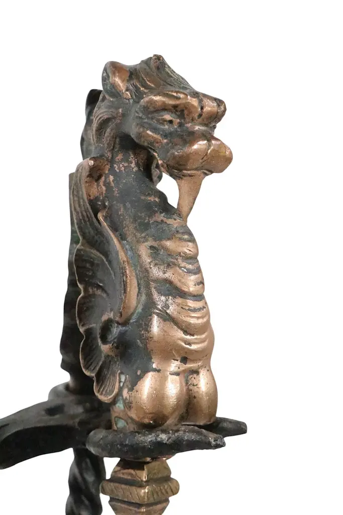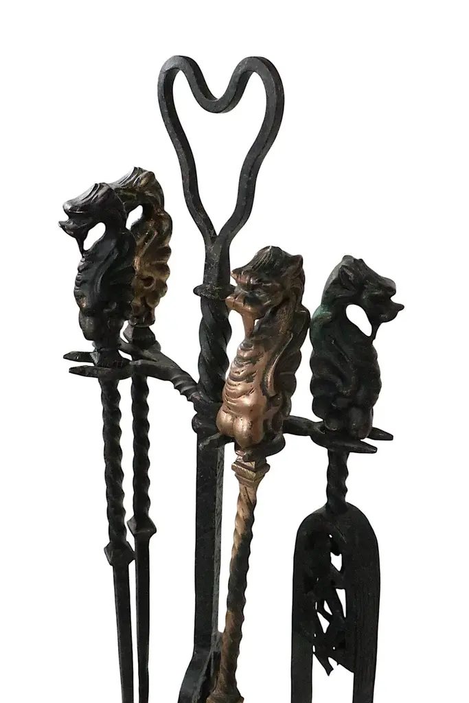 Exceptional 19th century set of wrought iron and cast bronze fireplace tools, with dragon, griffin handles. The set features inscribed line drawn decorative surfaces, with twisted and handworked details. Highly unusual and well crafted set, rare to find still intact, complete and undamaged. The set includes a fork, tongs, brush, poker and the stand. We believe the set was created in France, it is unsigned.