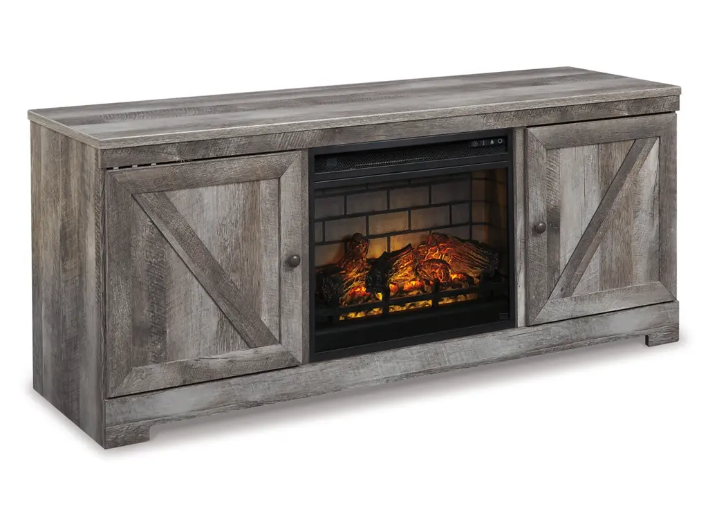 The Wynnlow TV stand with fireplace insert is sure to win your heart with its daring designer take on modern rustic. The stand’s crisp, clean and minimalist-chic profile is enriched with a striking replicated oak grain with thick plank styling and a weathered gray finish for that much more authentic character. Crossbuck detailing adds a brilliant barn door inspired touch. What really turns up the heat: an electric infrared fireplace insert with faux firebrick surround that operates with or without infrared heat. With the touch of a button, adjust the temperature and the flame brightness, and set the timer for long-lasting enjoyment.
