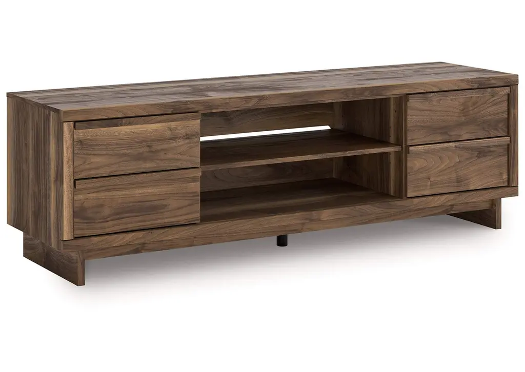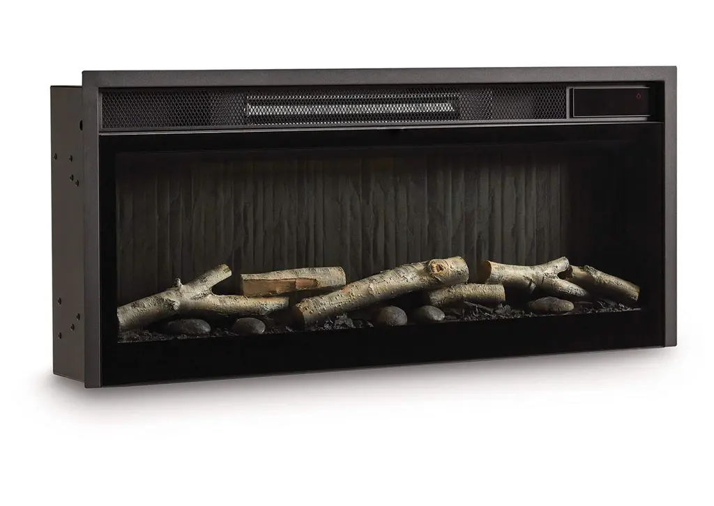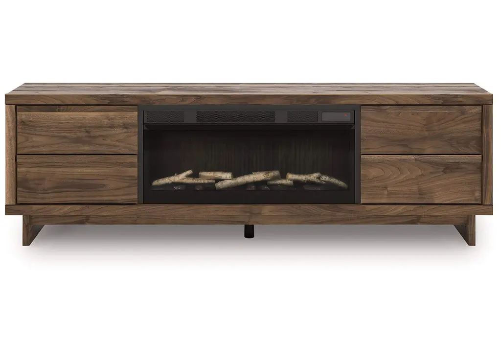 Nostalgic style, retooled for today’s trends. The Zadilyn TV stand with electric fireplace puts an elevated twist on mod aesthetics. Its warm brown tones reflect the mid-century vibes you love, while the angular base incorporates contemporary motifs. Integrated drawer handles round out the look in sleek style. For added ambiance, the electric fireplace brings a cozy-cool vibe to your living room. With the touch of a button, activate the LED-lit flame and adjust the temperature or the flame brightness. The flame effect includes multiple color options and a realistic-looking faux birch log set. Weight 173.000 lbs. (77.85kgs.)