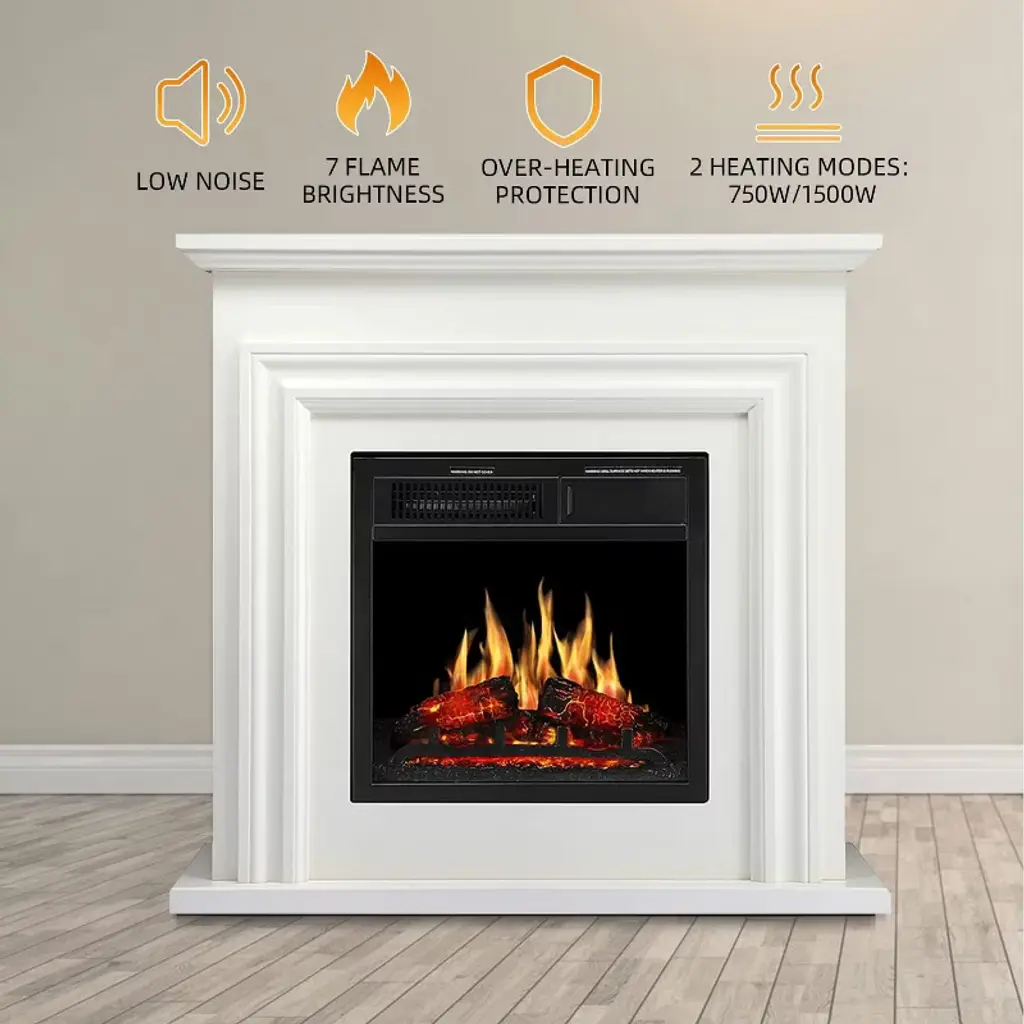 Electric Fireplace Mantel - Enjoy realistic dancing flames with 7 brightness levels & 2 heat modes (up to 400 sq. ft). Features 5m remote control, quiet operation (36dB), and modern wood design. Safe for kids/pets with overheating protection. Ships in 2 packages.