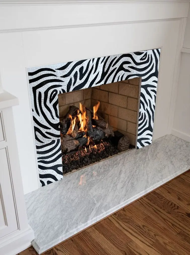 Transform your living space into a stunning sanctuary with the Zebra Pattern - Mosaic Fireplace. This exquisite mosaic fireplace is more than just a functional heating element; it's a breathtaking piece of art that embodies both style and warmth. Inspired by the majestic beauty of nature, the striking zebra pattern brings a unique flair and a sense of wild elegance to any room. Crafted with meticulous attention to detail, our Mosaic Fireplace features sleek lines and intricate designs that mimic the distinctive stripes of a zebra, creating a visual masterpiece that is sure to impress. The monochrome color scheme lends itself to versatility, allowing this fireplace surround to harmonize beautifully with a wide range of interior styles—from modern chic to rustic charm. This mosaic fireplace not only serves as a captivating focal point above your mantel but also enhances the overall ambiance of your space. Imagine cozy evenings spent in front of a warm fire, enveloped in the luxurious atmosphere this striking design creates. Whether you're entertaining guests, enjoying a quiet night at home, or simply seeking a stylish upgrade to your decor, the Zebra Pattern - Mosaic Fireplace is a perfect choice.Designed for those who appreciate both functionality and aesthetics, this custom mosaic fireplace surround elevates your living space, making it a testament to luxurious living. Don't just heat your home; transform it into an exquisite retreat with our Zebra Pattern - Mosaic Fireplace. Experience the wild splendor of nature right in your living room, and let this stunning piece inspire your design dreams.