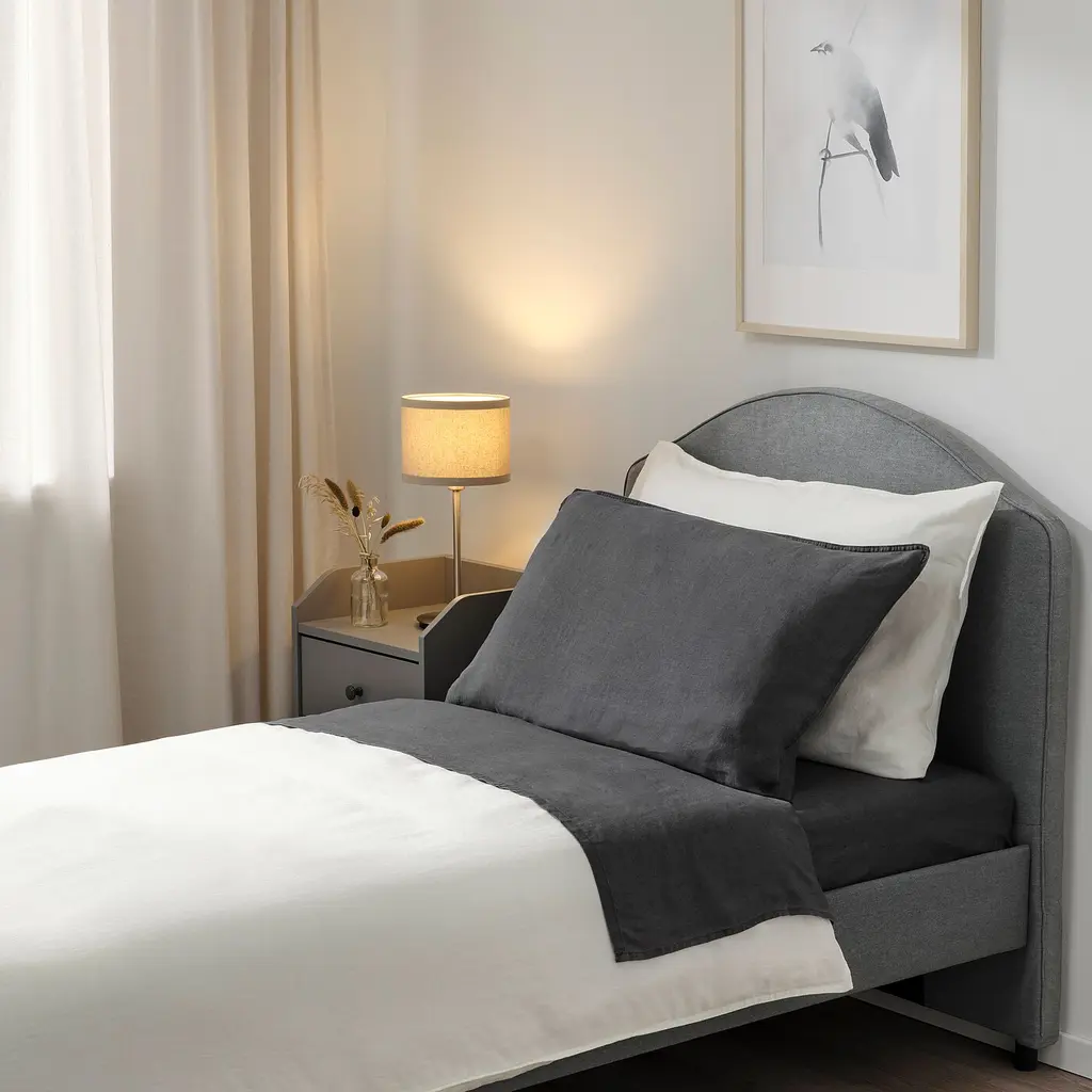 DYTÅG Sheet set - dark gray Twin. The 100% linen fabric is highly breathable and heat conducting. This means it keeps you warm in the winter and cool in hot weather, helping you to sleep comfortably and deeply. Durable and easy to care for, just wash on hot. 104 thread count.