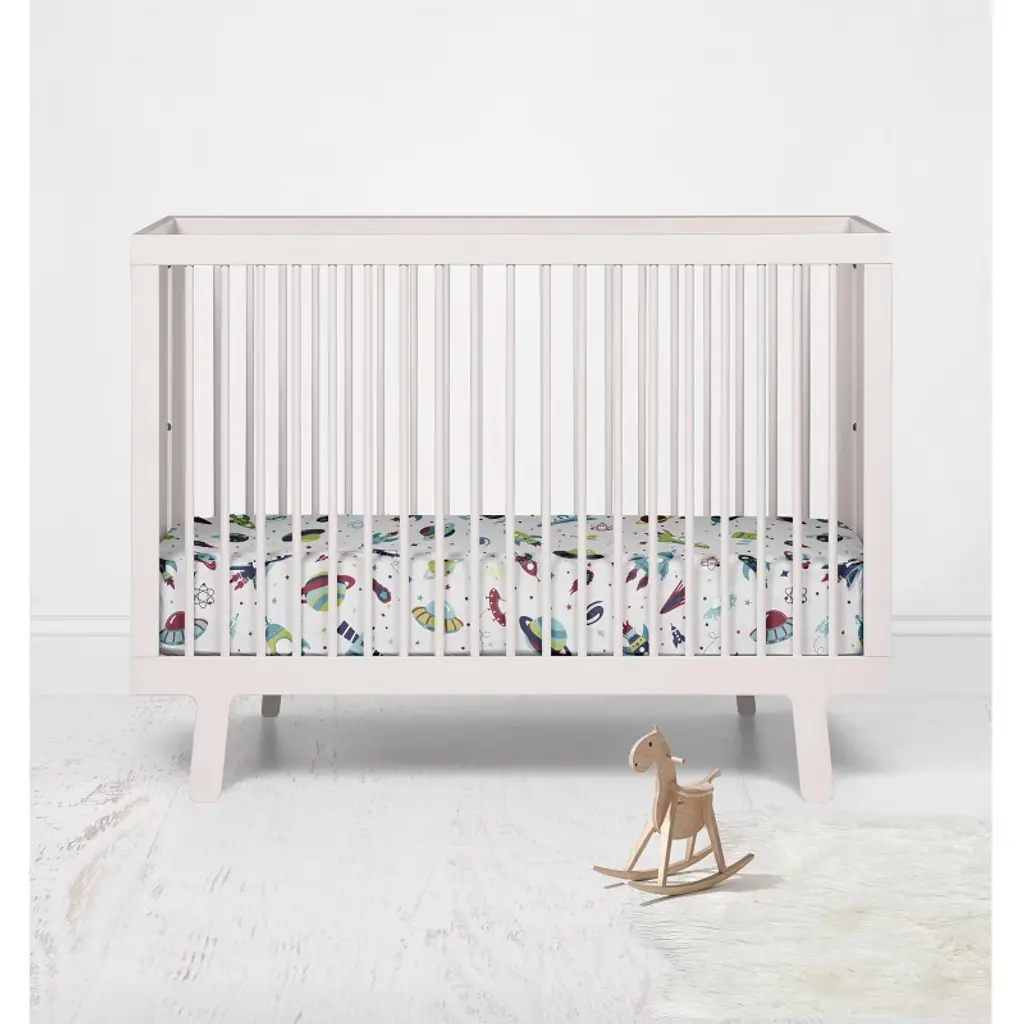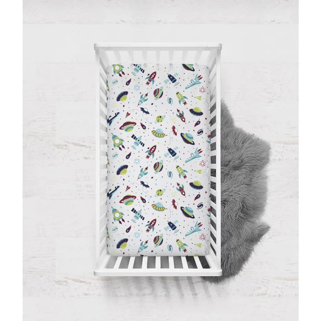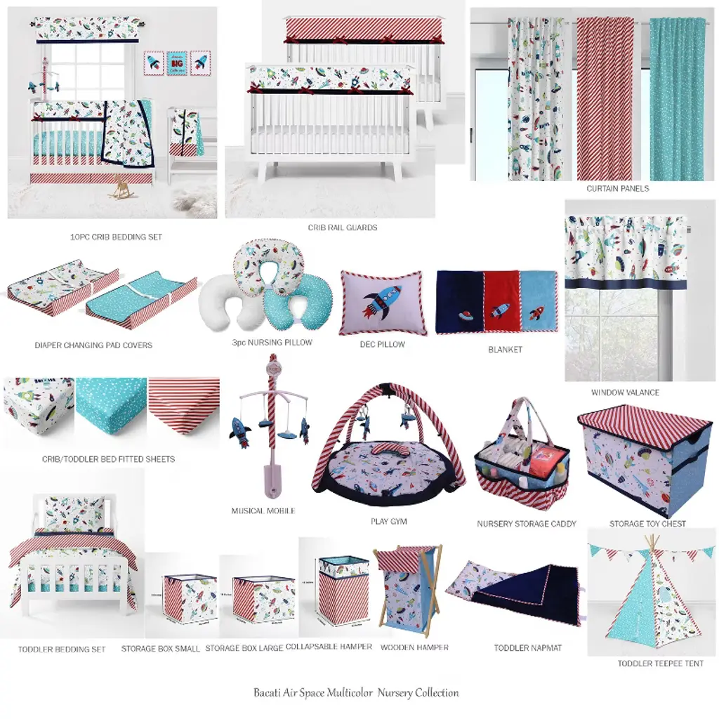 Bacati - Airspace Aqua Navy Red Lime Orange Crib Fitted Sheet made from 100 percent cotton percale fabric. Create a cozy and stylish nursery with Bacatis Premium 100% Cotton Percale Crib Sheets, designed to keep your baby comfortable all night long. Crafted from breathable, natural cotton, these fitted sheets feature a smooth, crisp feel that becomes softer with every wash. Measuring 52" x 28" x 7", they fit snugly on standard crib and toddler mattresses, ensuring a secure fit for a safe sleep environment. Certified to OEKO-TEX standards, these sheets are free from harmful chemicals and printed with azo-free dyes, making them gentle on delicate skin. Available in a variety of vibrant colors and Bacatis signature playful prints, these sheets add a charming touch to your nursery decor. Pair them with coordinating Bacati bedding and dcor for a complete look. With durable construction and thoughtful design, these crib sheets are made to withstand everyday use, offering a practical yet stylish solution for your little ones bedding