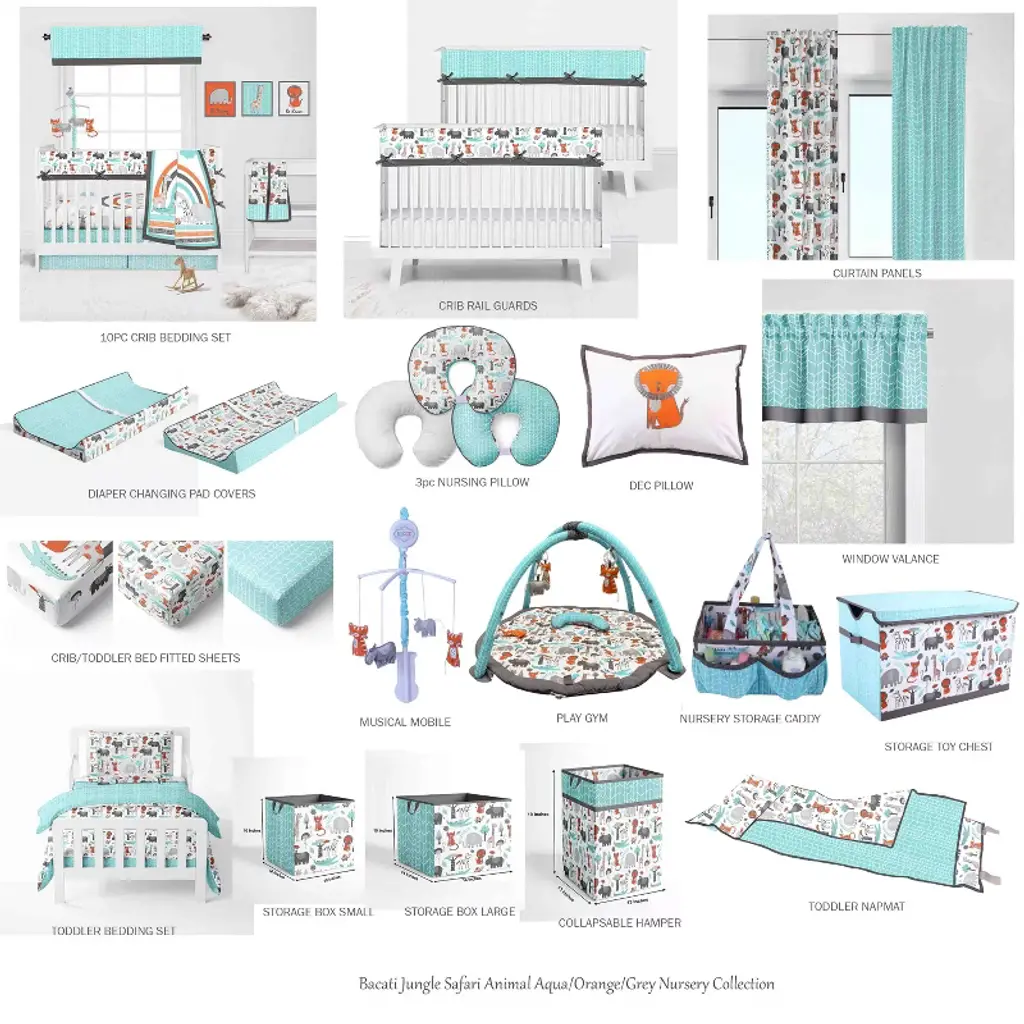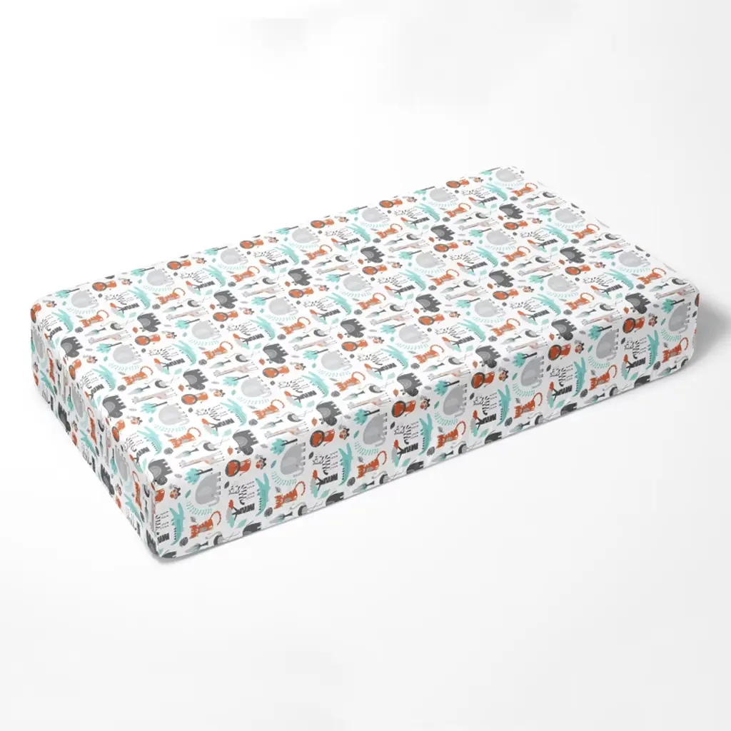 Bacati - Safari Animals Allover Print Aqua Orange Gray Crib Fitted Sheet made from 100 percent cotton percale fabric. Create a cozy and stylish nursery with Bacatis Premium 100% Cotton Percale Crib Sheets, designed to keep your baby comfortable all night long. Crafted from breathable, natural cotton, these fitted sheets feature a smooth, crisp feel that becomes softer with every wash. Measuring 52" x 28" x 7", they fit snugly on standard crib and toddler mattresses, ensuring a secure fit for a safe sleep environment. Certified to OEKO-TEX standards, these sheets are free from harmful chemicals and printed with azo-free dyes, making them gentle on delicate skin. Available in a variety of vibrant colors and Bacatis signature playful prints, these sheets add a charming touch to your nursery decor. Pair them with coordinating Bacati bedding and dcor for a complete look. With durable construction and thoughtful design, these crib sheets are made to withstand everyday use, offering a practical yet stylish solution for your little ones bedding.