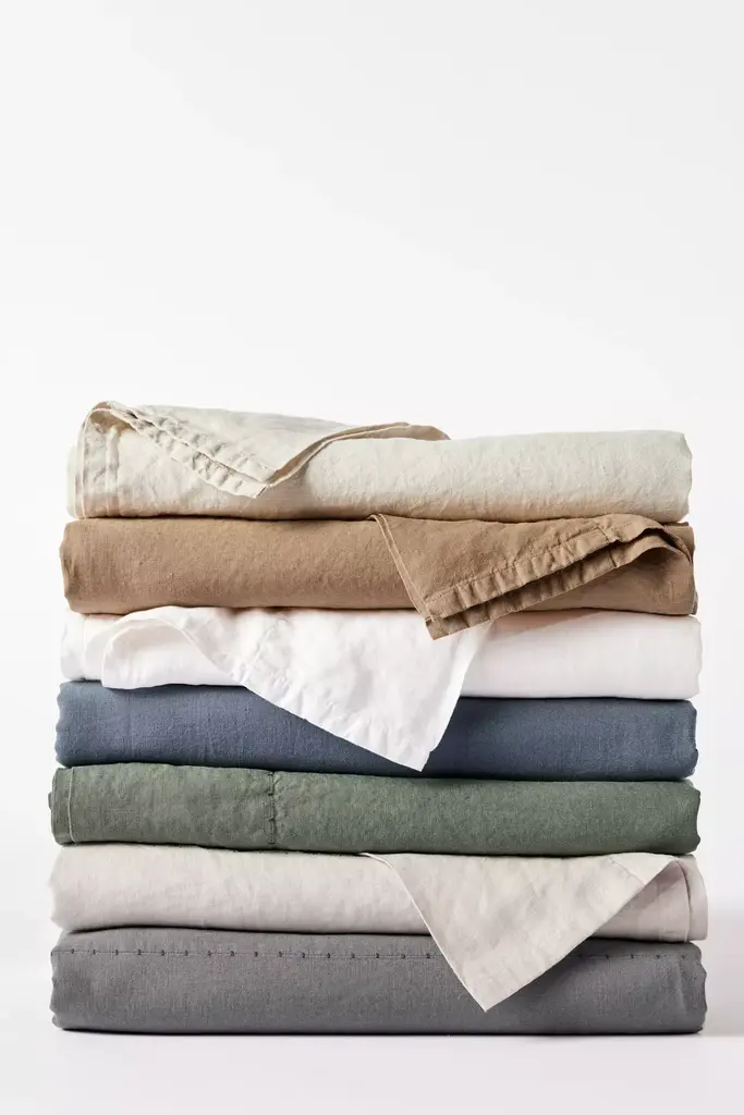 Woven to a sturdy weight and garment washed for a relaxed hand, these sheets are durable enough to dress the bed year-round and are destined to become more supple with every wash. Color-matched pick stitching lends subtle detail to the cuffs, while a deep 15" pocket and full elastic ensure an easy fit on a range of mattress styles.Coyuchi produces high-quality linens from minimally processed natural and organic fibers in responsible and ethical factories. With a relaxed palette inspired by the coast, Coyuchi products are crafted without compromise to design, comfort or the planet. * 100% Organic Linen* Machine washable. Wash on delicate cycle with like colors, cold water and a plant based detergent. Whiteners not recommended. Only use non-chlorine bleach. Line dry or tumble dry low. * Imported#### *Dimensions** Twin: 15" x 39" x 75"* Full: 15" x 54" x 75"* Queen 15" x 60" x 80"* King: 15" x 78" x 80"* Cal King: 15" x 72" x 84"