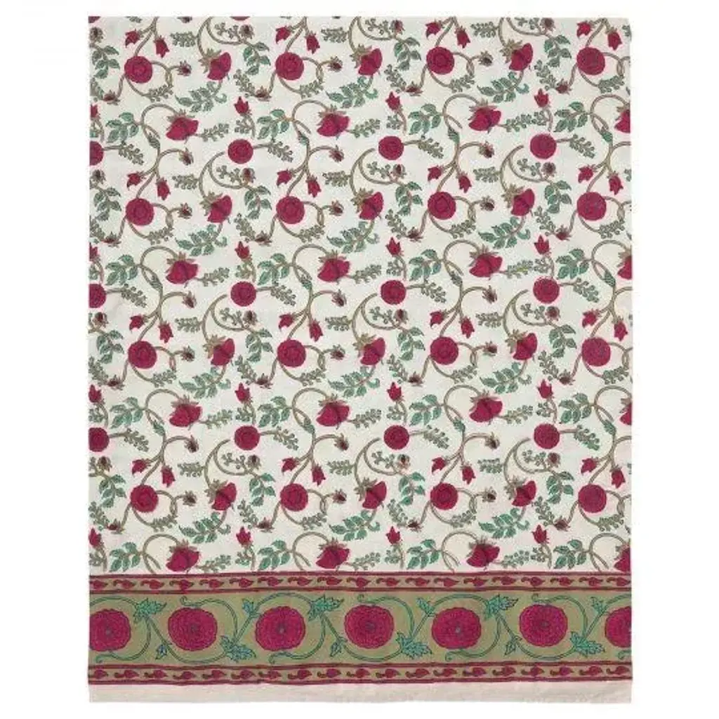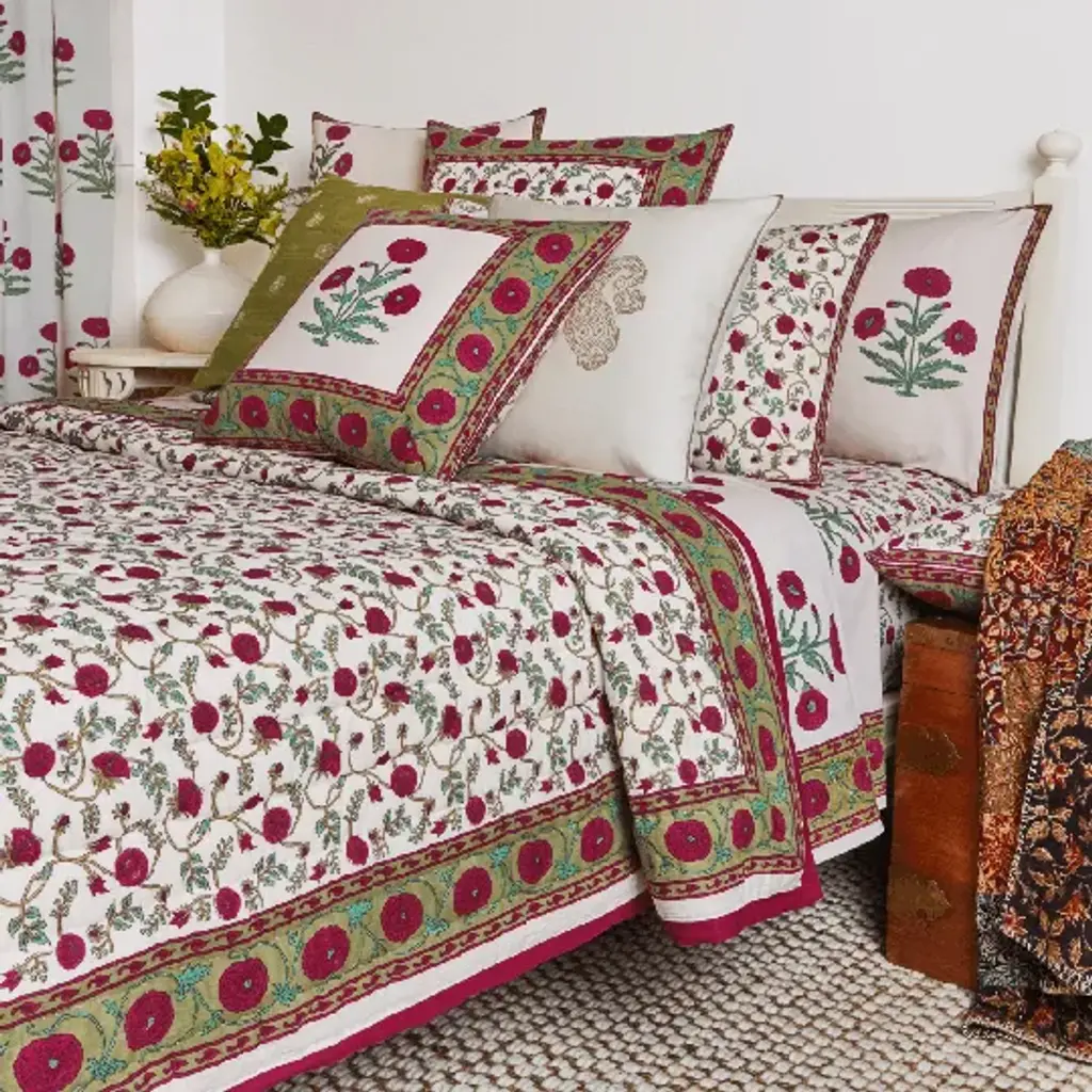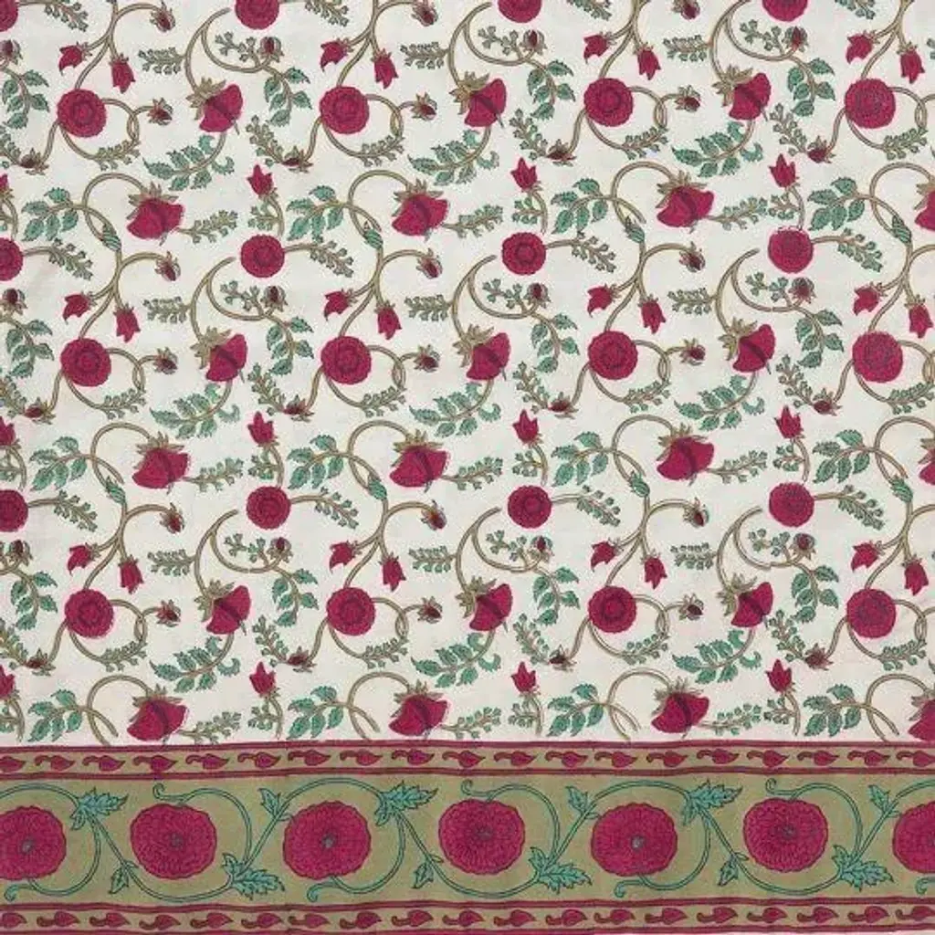 The Gina design draws upon Mughal influences, featuring a floral vine pattern in magenta pink on cream. A stately border of meandering poppy blossoms on green makes for a stunning finish. Kick off your comforter and stay cool during summer with these Indian block print sheets or layer them under your bed covers for extra warmth during colder months. Marigold Living fitted and flat sheets are individually hand-printed using ancient woodblock printing techniques. Flat sheets have borders, fitted sheets do not. Materials: Sheets are made of 300-thread count cotton. Crafts: Hand block printing. DIMENSIONS Fitted Sheet: 60" wide x 80" long x 17” deep CARE & MAINTENANCE Protect from direct sunlight when using. Hand or machine wash separately in cold water in a short, low-spin, gentle cycle. Use a mild detergent without any bleach or fabric softeners. Do not soak or wring the fabrics. Scrub gently if needed. Tumble dry on low heat or air dry in the shade. Iron at medium setting. Test stain remover on a small area before applying.