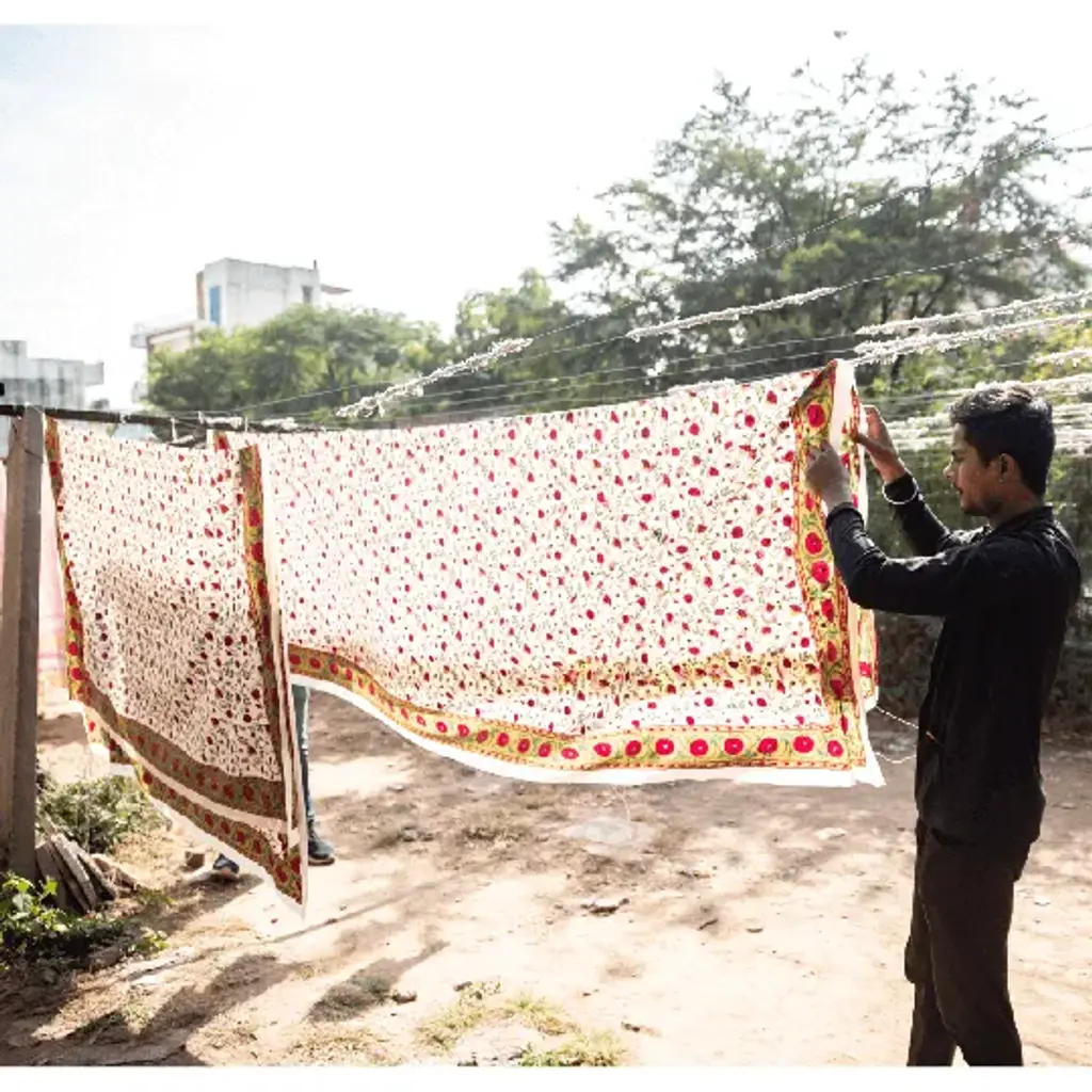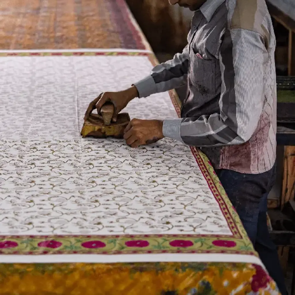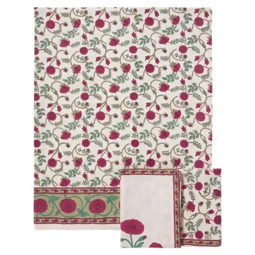The Gina design draws upon Mughal influences, featuring a floral vine pattern in magenta pink on cream. A stately border of meandering poppy blossoms on green makes for a stunning finish. Kick off your comforter and stay cool during summer with these Indian block print sheets or layer them under your bed covers for extra warmth during colder months. Marigold Living fitted and flat sheets are individually hand-printed using ancient woodblock printing techniques. Flat sheets have borders, fitted sheets do not. Materials: Sheets are made of 300-thread count cotton. Crafts: Hand block printing. DIMENSIONS Fitted Sheet: 60" wide x 80" long x 17” deep CARE & MAINTENANCE Protect from direct sunlight when using. Hand or machine wash separately in cold water in a short, low-spin, gentle cycle. Use a mild detergent without any bleach or fabric softeners. Do not soak or wring the fabrics. Scrub gently if needed. Tumble dry on low heat or air dry in the shade. Iron at medium setting. Test stain remover on a small area before applying.