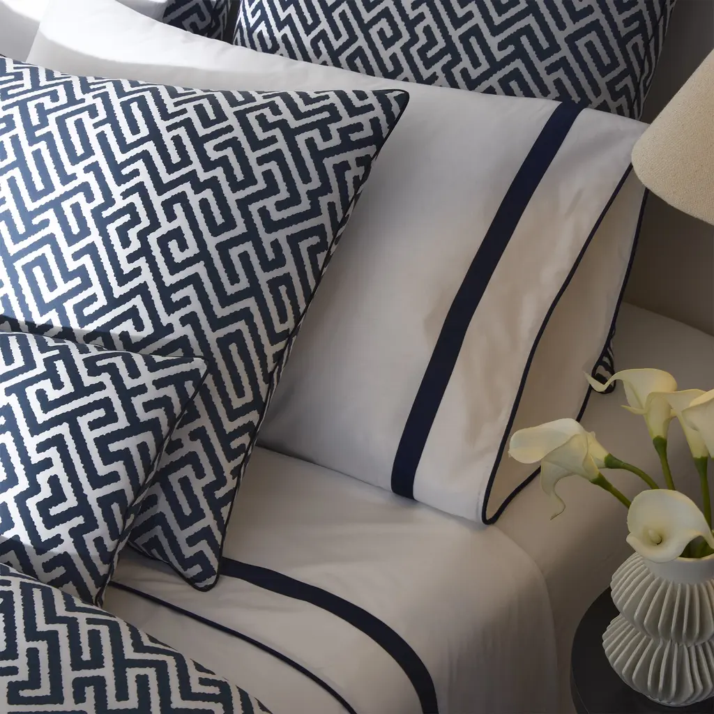 Gabriel is a Matouk Schumacher print featuring a striking geometric motif and complementary corded edge. Reminiscent of a finely woven tapestry, its design introduces dynamic movement and dimension to the bed - boldly graphic yet elegantly refined.