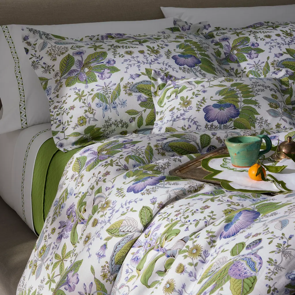Alive with vivid florals and lush foliage, the Schumacher Pomegranate design that appears on one of Matouk's most popular percale styles is now reimagined for the signature Roman linen line.
