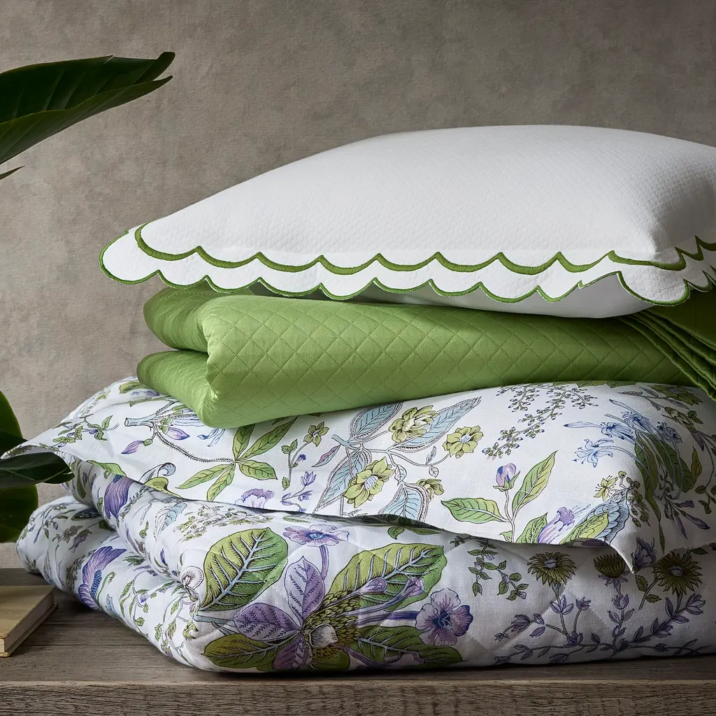 Alive with vivid florals and lush foliage, the Schumacher Pomegranate design that appears on one of Matouk's most popular percale styles is now reimagined for the signature Roman linen line.