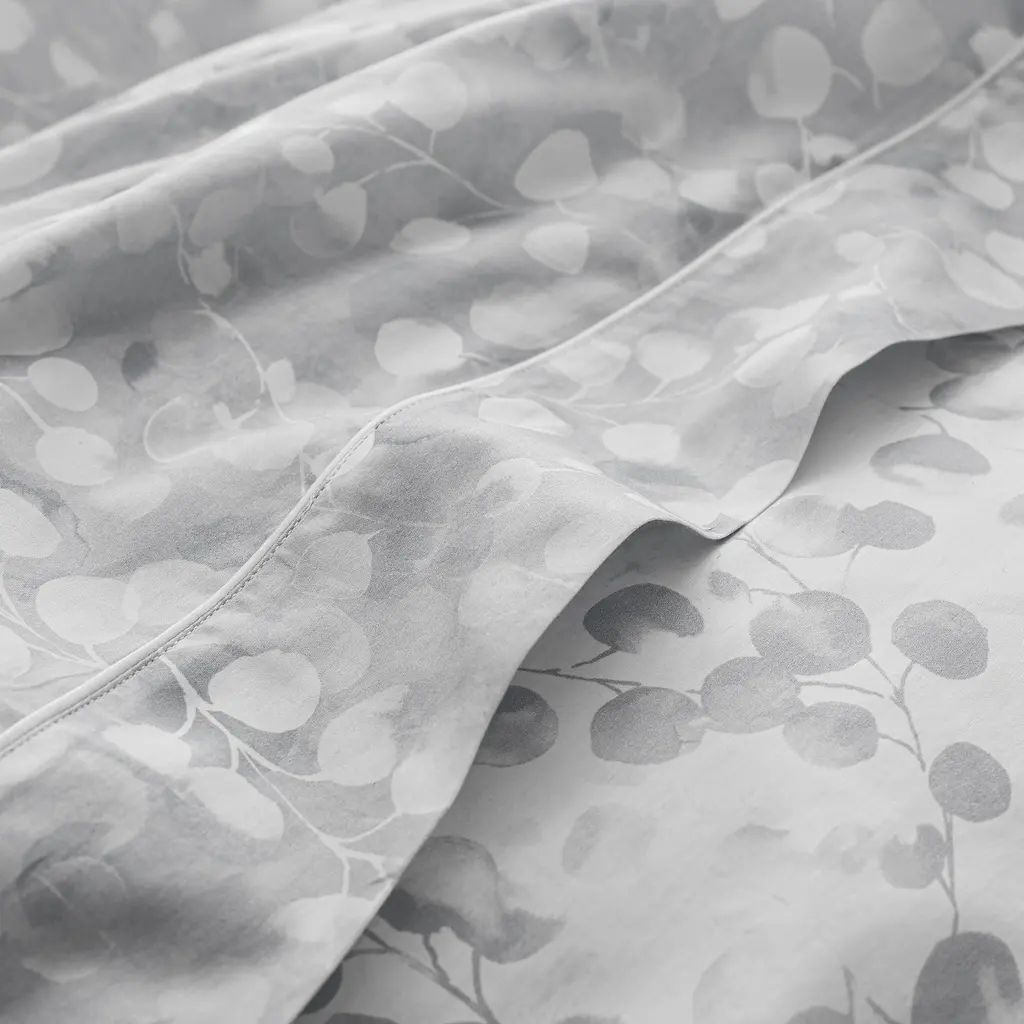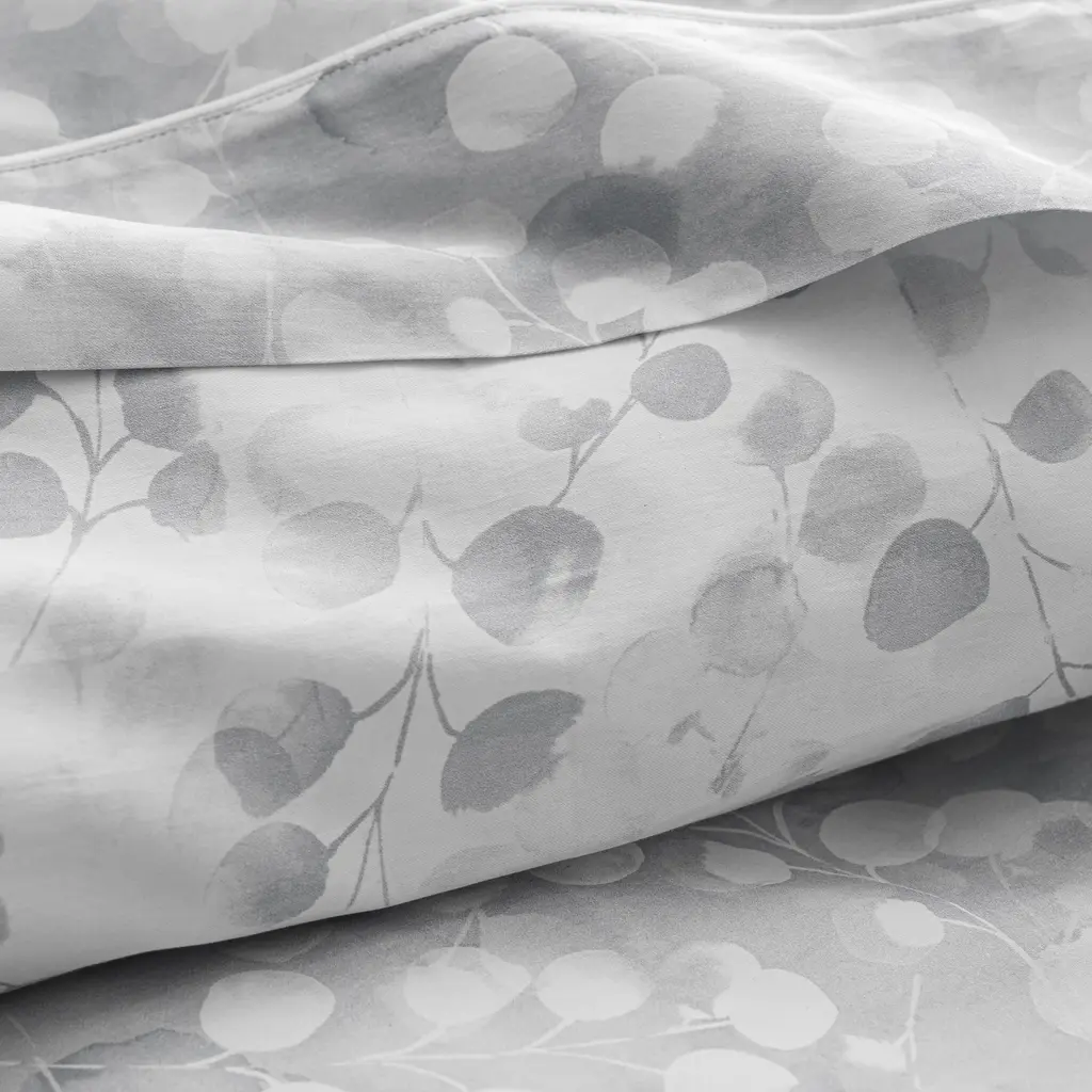 The softness and watercolor transparency of the Honesty flower are played out on a delicate superposition of light and shadow. The sheets offer formal, airy, evanescent lightness on sumptuously soft sateen. This stunning botanical design of Honesty flower seed pods has a contemporary, sophisticated vibe. It's a chic, somewhat abstract design combining two prints - one of Honesty seed pods on a white ground and one of white printed Honesty seed pods on a colored ground. If one does not already know or recognize the print to be that of seed heads, then the Rosée design looks like a design of stylized contemporary forms.