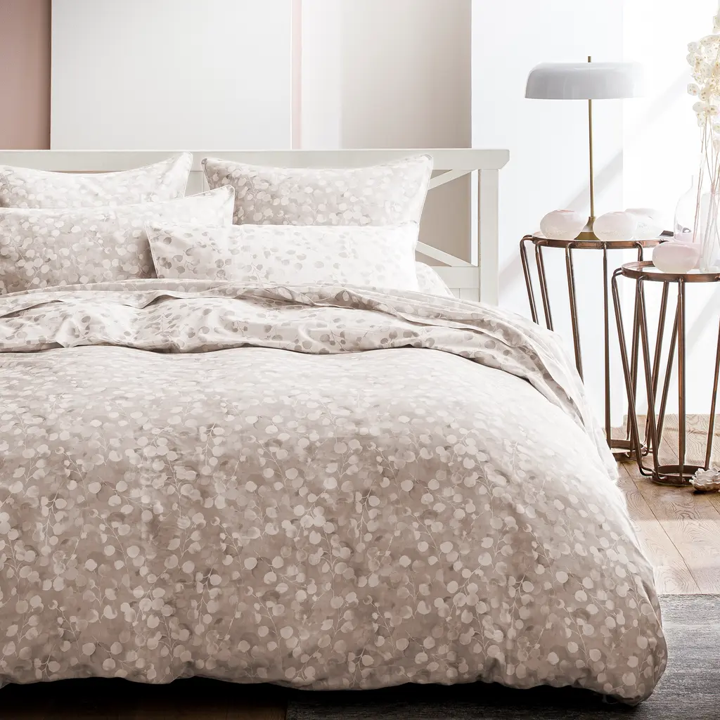 The softness and watercolor transparency of the Honesty flower are played out on a delicate superposition of light and shadow. The sheets offer formal, airy, evanescent lightness on sumptuously soft sateen. This stunning botanical design of Honesty flower seed pods has a contemporary, sophisticated vibe. It's a chic, somewhat abstract design combining two prints - one of Honesty seed pods on a white ground and one of white printed Honesty seed pods on a colored ground. If one does not already know or recognize the print to be that of seed heads, then the Rosée design looks like a design of stylized contemporary forms.