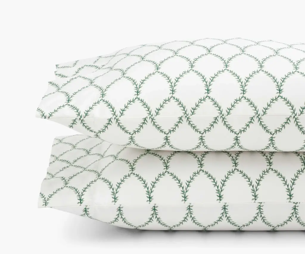 Arbors of delicate leaves arc across a solid ivory ground to create a pattern with a classic feel. Offered in your choice of three colorways, gold, blue, and sage, these sheets were created to layer with our other printed sateen bedding collections and coordinating Matelasse (sold separately). Crafted of buttery-soft and breathable sateen, this bedding collection has a subtle sheen and beautiful drape that's perfect for all-season comfort. Part of the Rifle Paper Co. x The Company Store collection.
