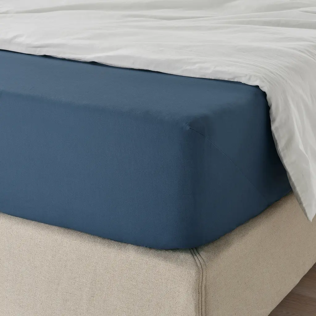 ULLVIDE Fitted sheet - dark blue King. The lyocell/cotton blend absorbs and draws moisture away from your body and keeps you dry all night long. Extra soft and durable quality since the bedlinen is densely woven from fine yarn. 200 thread count.