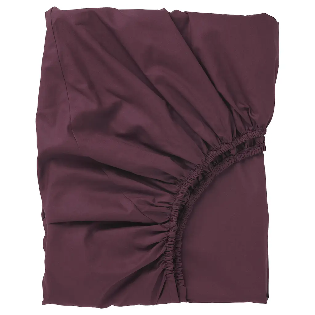ULLVIDE Fitted sheet - deep red Queen. The tight percale weave makes the fabric very durable and resistant to pilling. It has a matte surface and is wonderfully crisp, soft and cool to sleep in. Fits mattresses with a thickness up to 10" since the fitted sheet has elastic edging all around.