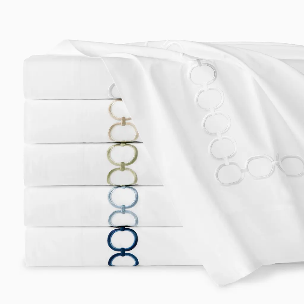Sleek and modern, the Catena Collection from SFERRA displayes a minimalist chain motif inspired by the timelessness of fine jewelry. Framing a canvas of pristine white percale crafted from long-staple cotton, the design is embroidered with immaculate precision in a white and sand colorway. Two-tone embroidery creates a sense of depth.