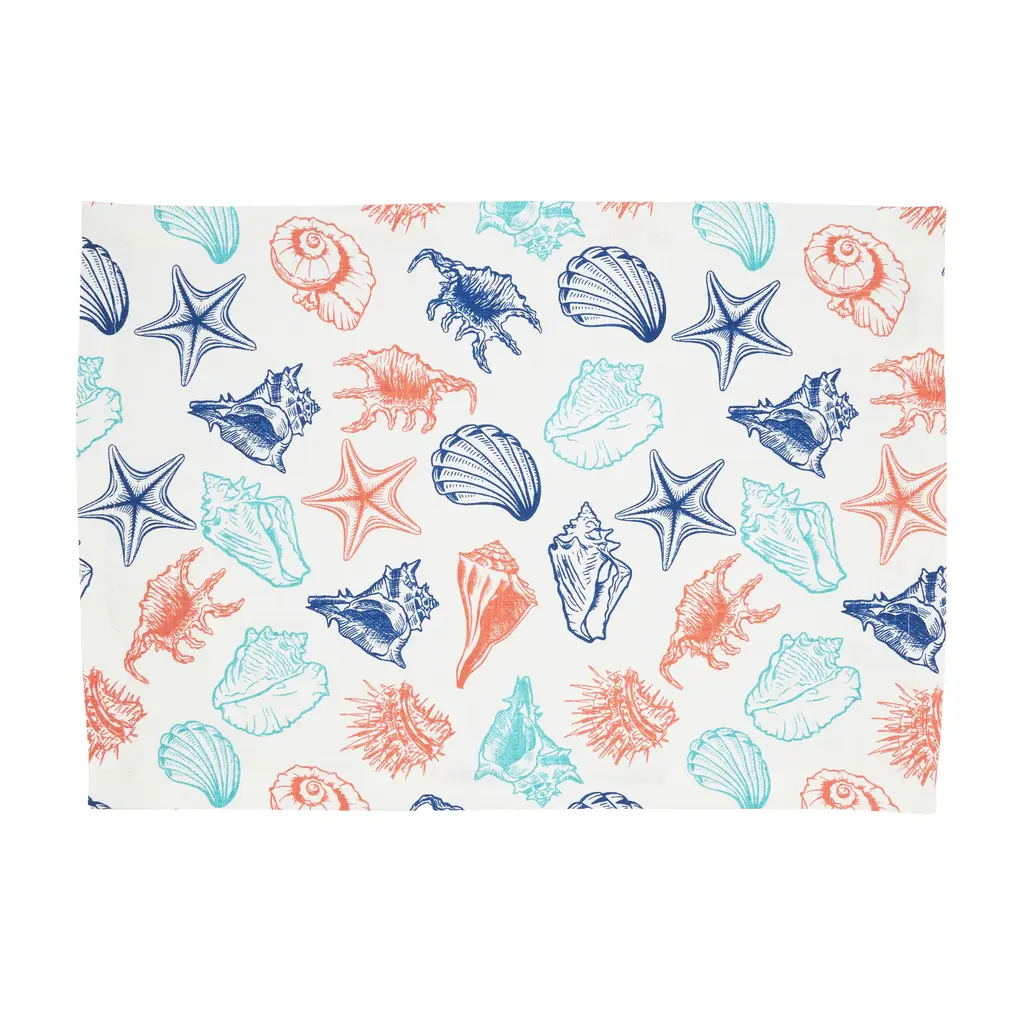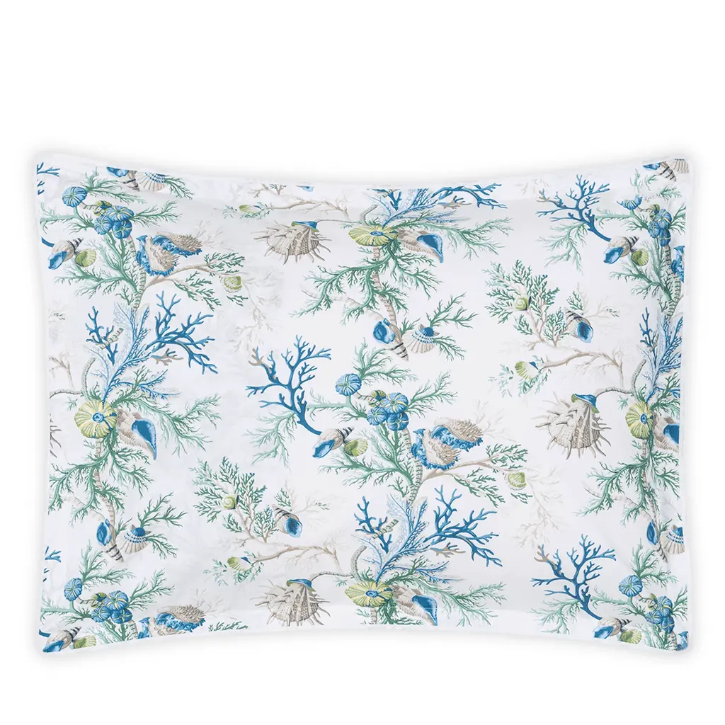 Create a lovely oasis in your bedroom with Matouk's Del Tesoro Collection. In crisp percale, the bedding contrasts seashells with vibrant aquatic life to create a stunning motif.