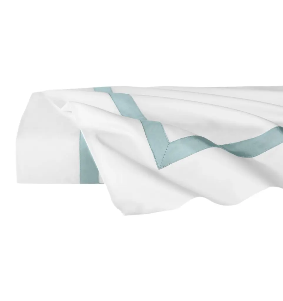 The understated sophistication of Estate's crisp white, Italian-woven long-staple cotton base is an immaculate backdrop for lustrous sateen appliqué detail, beautifully bordering this collection to create a sense of tailored elegance.