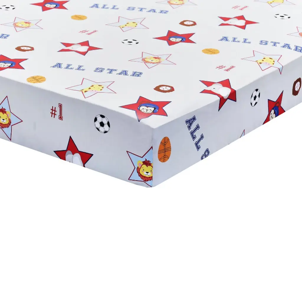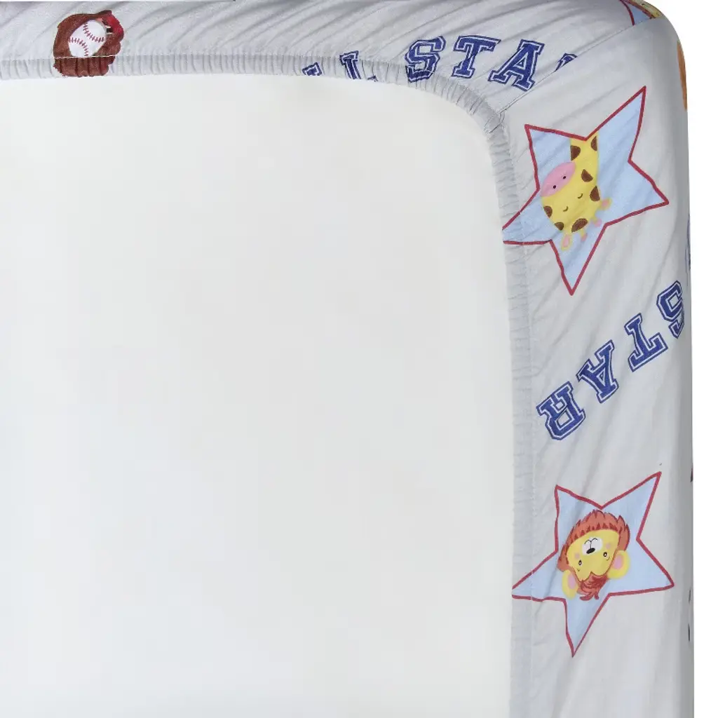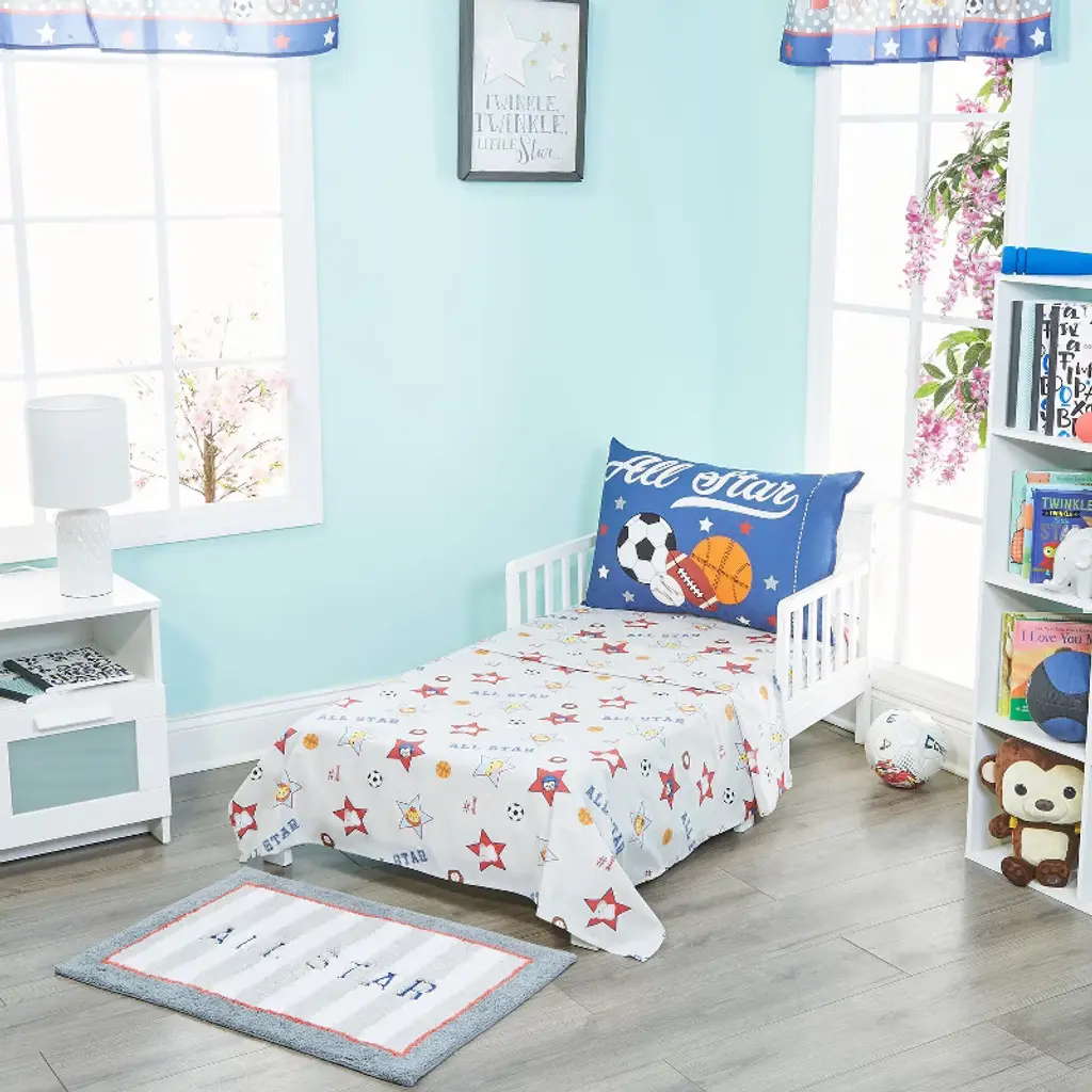 Soft, cozy bedding set eases toddler’s crib transition with fun designs. Made from breathable, fade-resistant 100% cotton percale for comfort. Machine washable; use gentle cycle, cold water, and low heat drying. Includes comforter, flat sheet, fitted sheet, and reversible pillowcase. Fitted sheet fits standard 52" x 28" toddler mattress with 8" pocket. Tested on many mattresses for perfect fit and secure hold. Creates a calming, restful sleep environment for toddlers. Family-owned brand dedicated to affordable, quality kids’ bedding products. Description While we can not promise you that your kids will stop asking for just one more bedtime story, buying a toddler bedding set they love could make bedtime easier. Featuring colorful animal, football, baseball, basketball and soccer images, this Jungle Sports toddler bedding includes a comforter printed with cute jungle animals dressed up and ready for playtime. The fitted and flat sheets include an allover print of jungle animals, sports and stars on a white background. Sport fans will love the football, baseball, basketball and soccer images on one side of the reversible pillowcase. Turn it over for an encouraging blue #1 on a background of silver stars. Soft, cozy and colorful, these children's comforter sets are made from ultra-soft, breathable 100% cotton percale and can help make the transition to a big kid bed even more fun. The toddler bedding set includes a comforter that is 57” by 42”, a flat sheet that is 60“ by 45”, a fitted sheet that is 52” by 28” and a reversible pillowcase that is 30” by 20”.