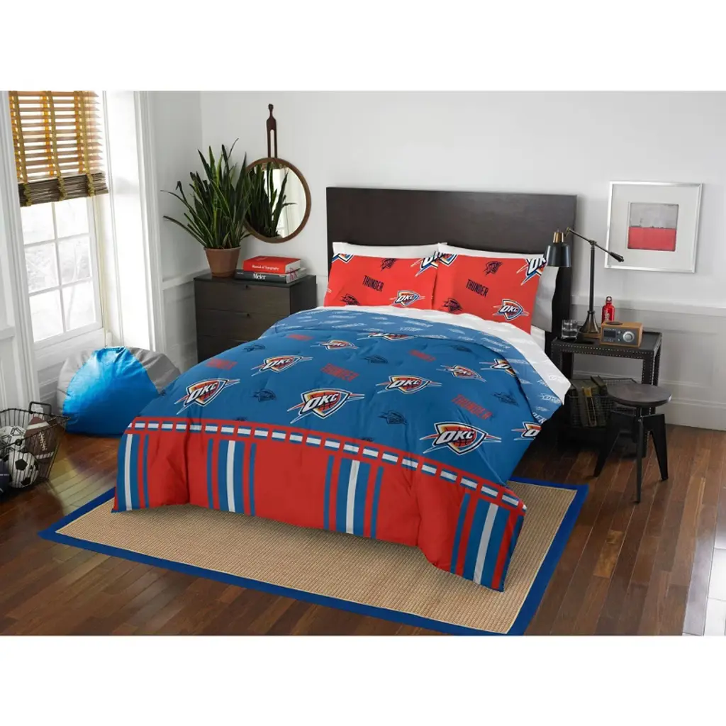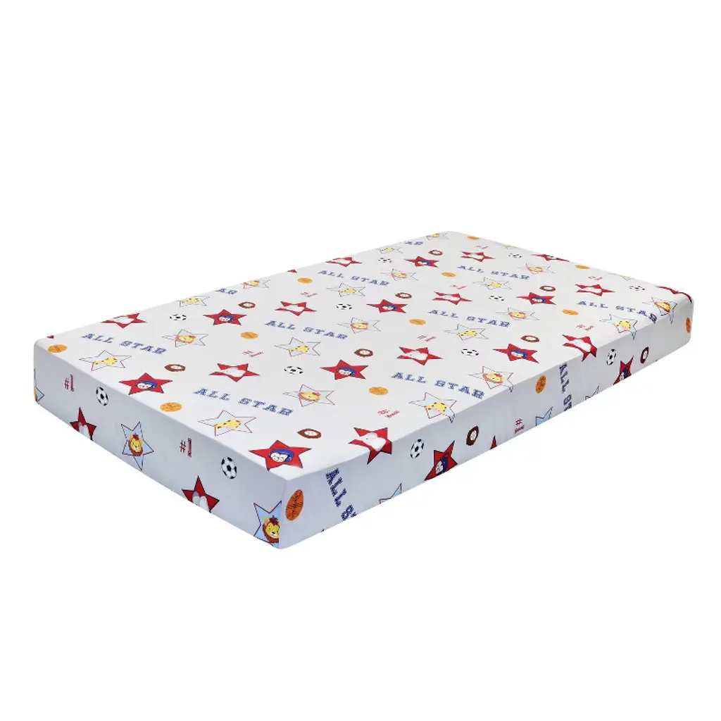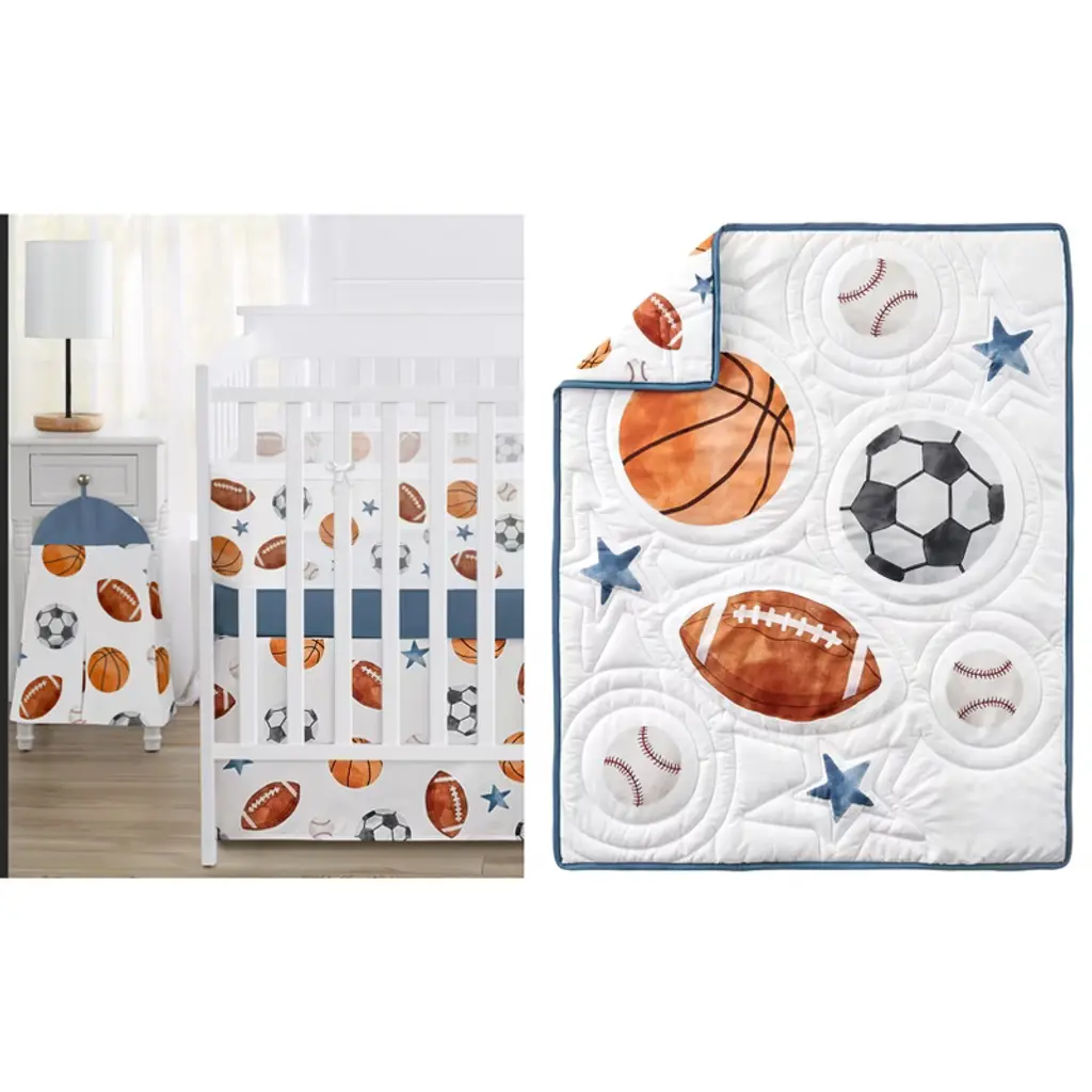 Soft, cozy bedding set eases toddler’s crib transition with fun designs. Made from breathable, fade-resistant 100% cotton percale for comfort. Machine washable; use gentle cycle, cold water, and low heat drying. Includes comforter, flat sheet, fitted sheet, and reversible pillowcase. Fitted sheet fits standard 52" x 28" toddler mattress with 8" pocket. Tested on many mattresses for perfect fit and secure hold. Creates a calming, restful sleep environment for toddlers. Family-owned brand dedicated to affordable, quality kids’ bedding products. Description While we can not promise you that your kids will stop asking for just one more bedtime story, buying a toddler bedding set they love could make bedtime easier. Featuring colorful animal, football, baseball, basketball and soccer images, this Jungle Sports toddler bedding includes a comforter printed with cute jungle animals dressed up and ready for playtime. The fitted and flat sheets include an allover print of jungle animals, sports and stars on a white background. Sport fans will love the football, baseball, basketball and soccer images on one side of the reversible pillowcase. Turn it over for an encouraging blue #1 on a background of silver stars. Soft, cozy and colorful, these children's comforter sets are made from ultra-soft, breathable 100% cotton percale and can help make the transition to a big kid bed even more fun. The toddler bedding set includes a comforter that is 57” by 42”, a flat sheet that is 60“ by 45”, a fitted sheet that is 52” by 28” and a reversible pillowcase that is 30” by 20”.