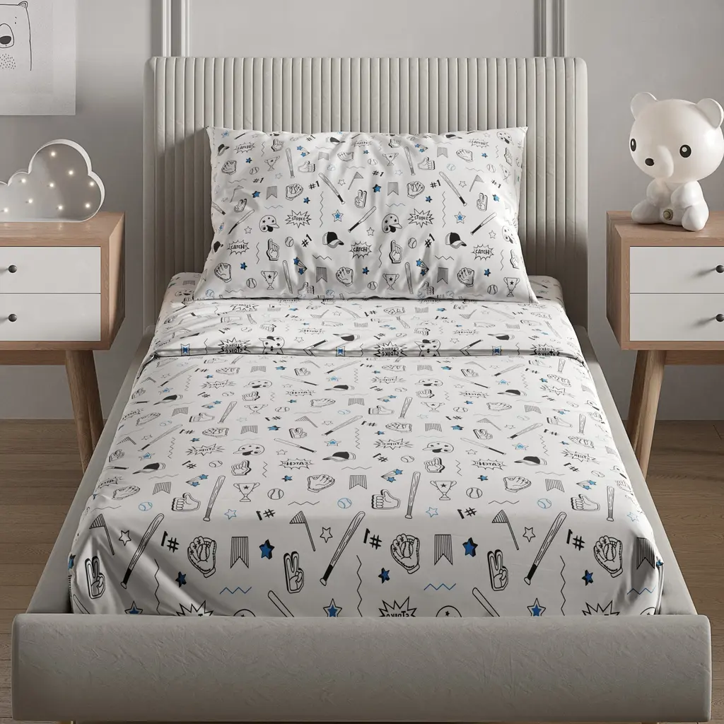 Everyday Kids 4-piece Toddler Bedding Set Jungle Sports - Soft 100% Cotton Percale Comforter, Flat Sheet, Fitted Sheet & Reversible Pillowcase