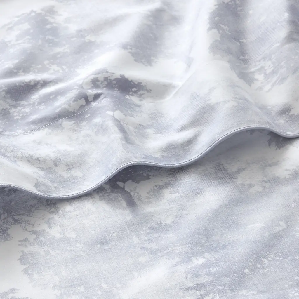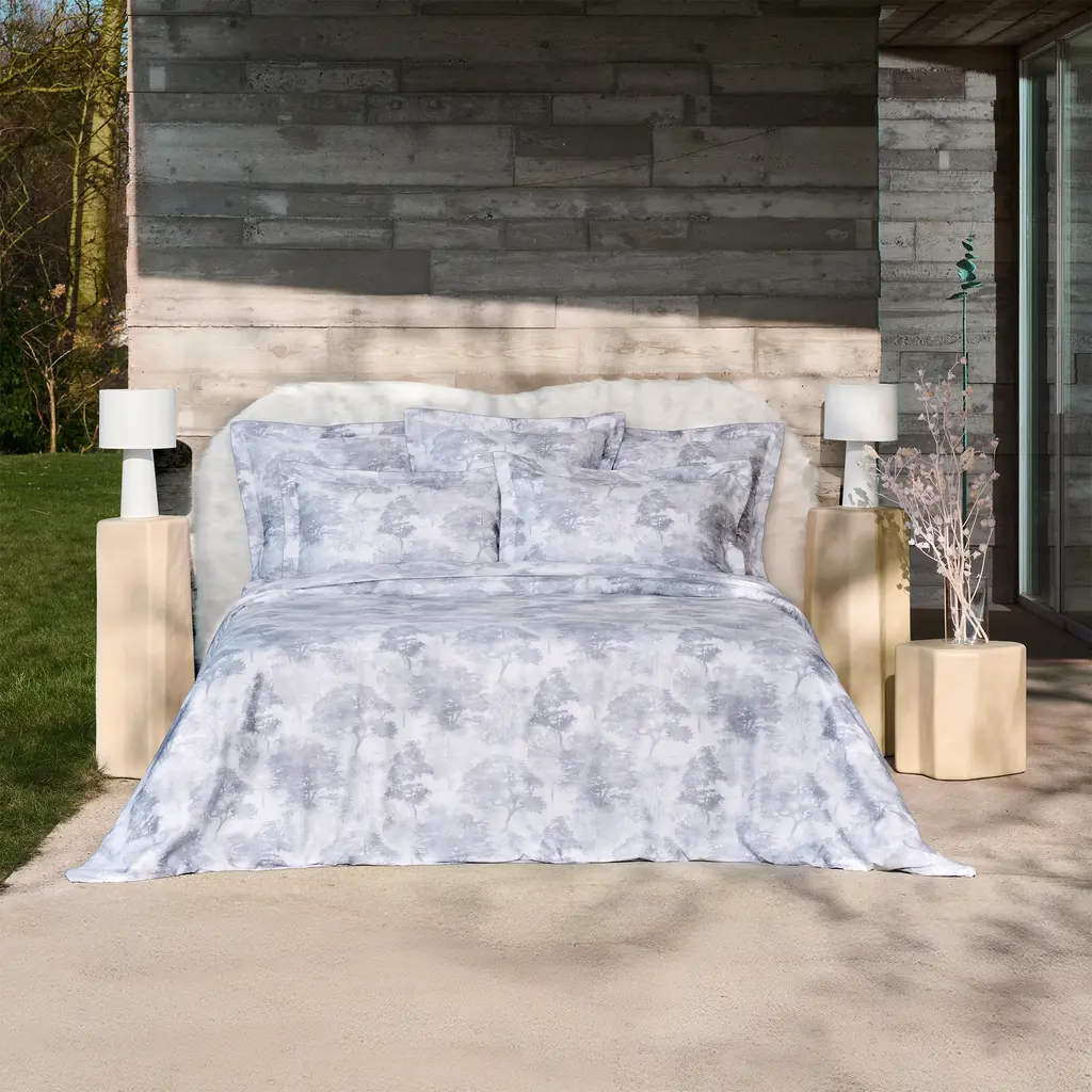Shades of frost offer a gradient of blues with the virtues of calm and stability. A delicate sculptor of cold nights, frost shrouds the trees in a magical aura. His presence awakens a sense of sacred silence, where nature seems to hold its breath, frozen in a pause that is as beautiful as it is elusive. Anne de Solene's Silence Sheets feature a modern, peaceful design of silhouetted maple trees, coordinated with a fine-gauge irregular stripe print. Frosty blues on a white ground.