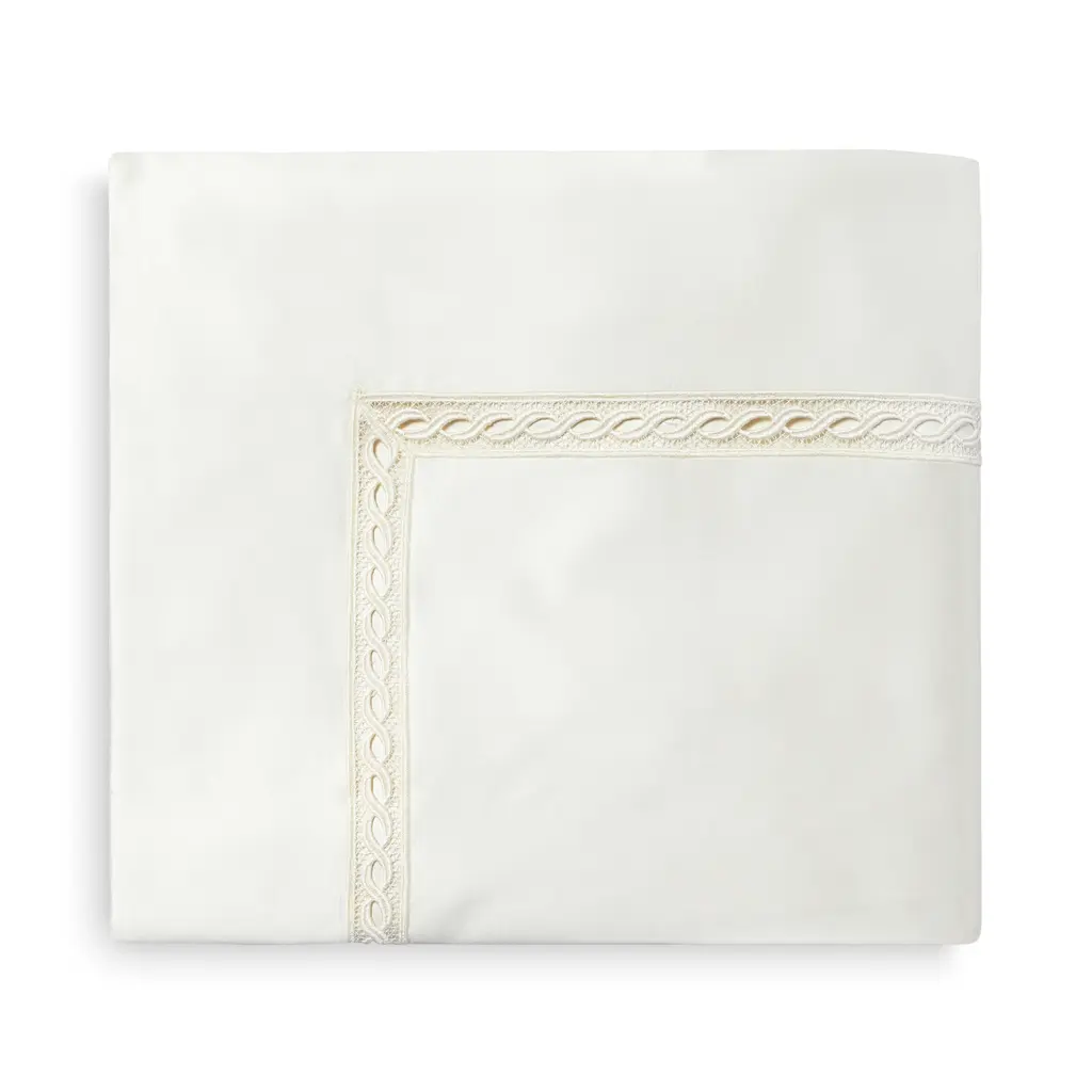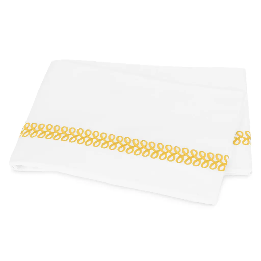 Clean, classic bedding featuring graceful embroidered knots on crisp, white 500-thread count Egyptian cotton percale. Duvet covers have embroidery running head to foot for a simple yet striking touch.