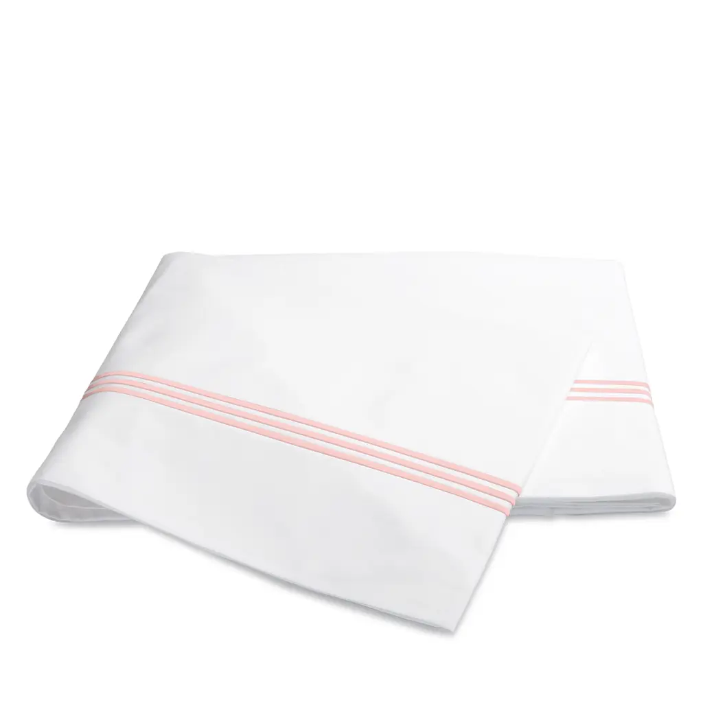 A classic bedding collection in crisp, white 600-thread count Egyptian cotton percale with a tape border in muted hues. A coordinating coverlet features an all over pearl matelasse design.