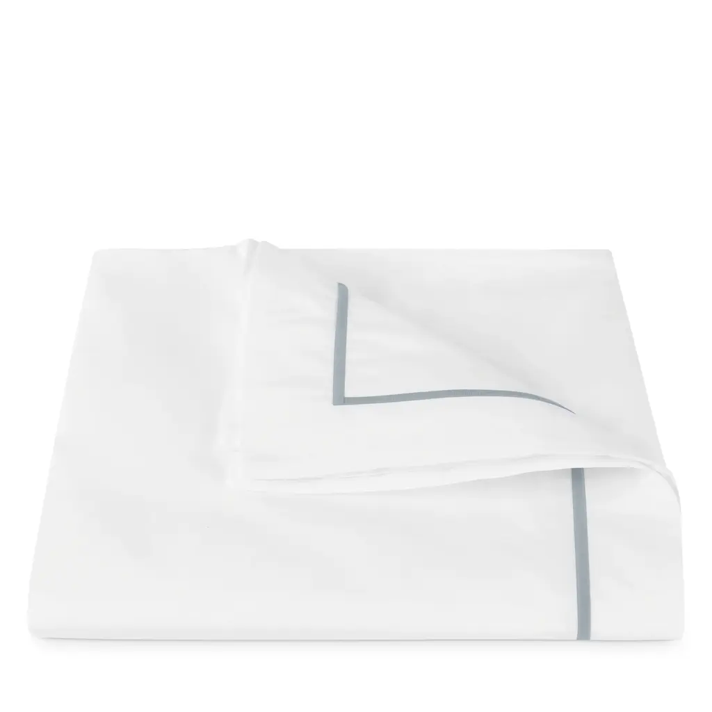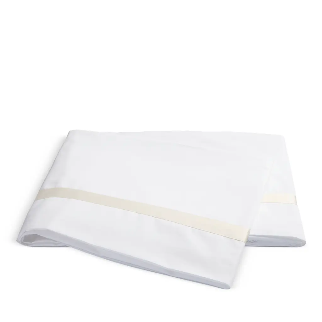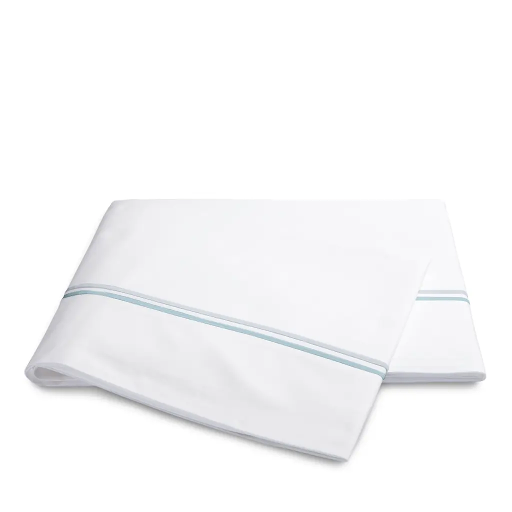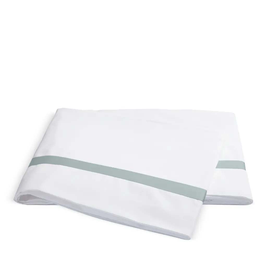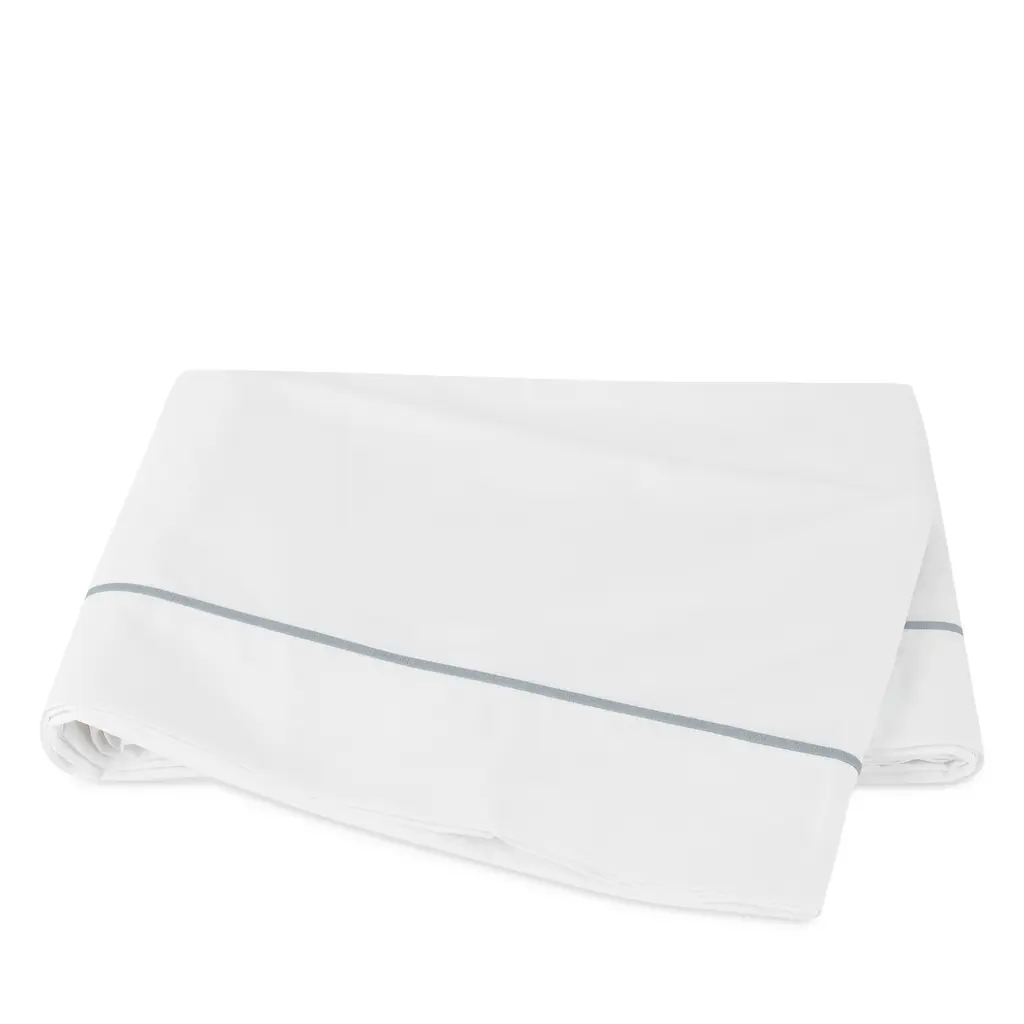 A classic bedding collection in crisp, white 600-thread count Egyptian cotton percale with a tape border in muted hues. A coordinating coverlet features an all over pearl matelasse design.
