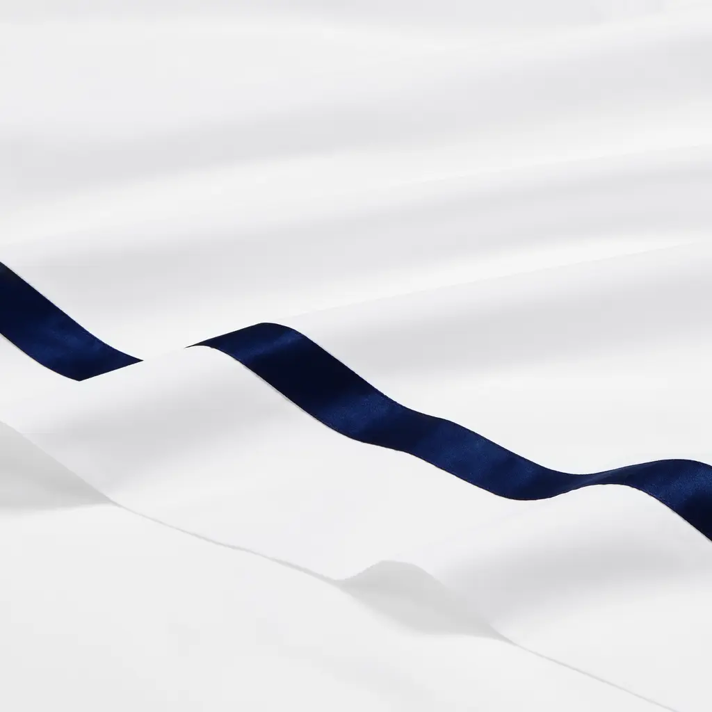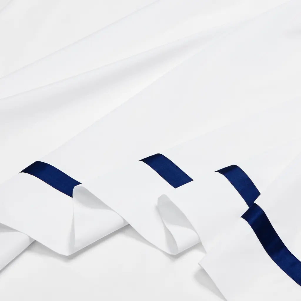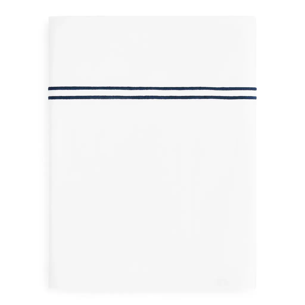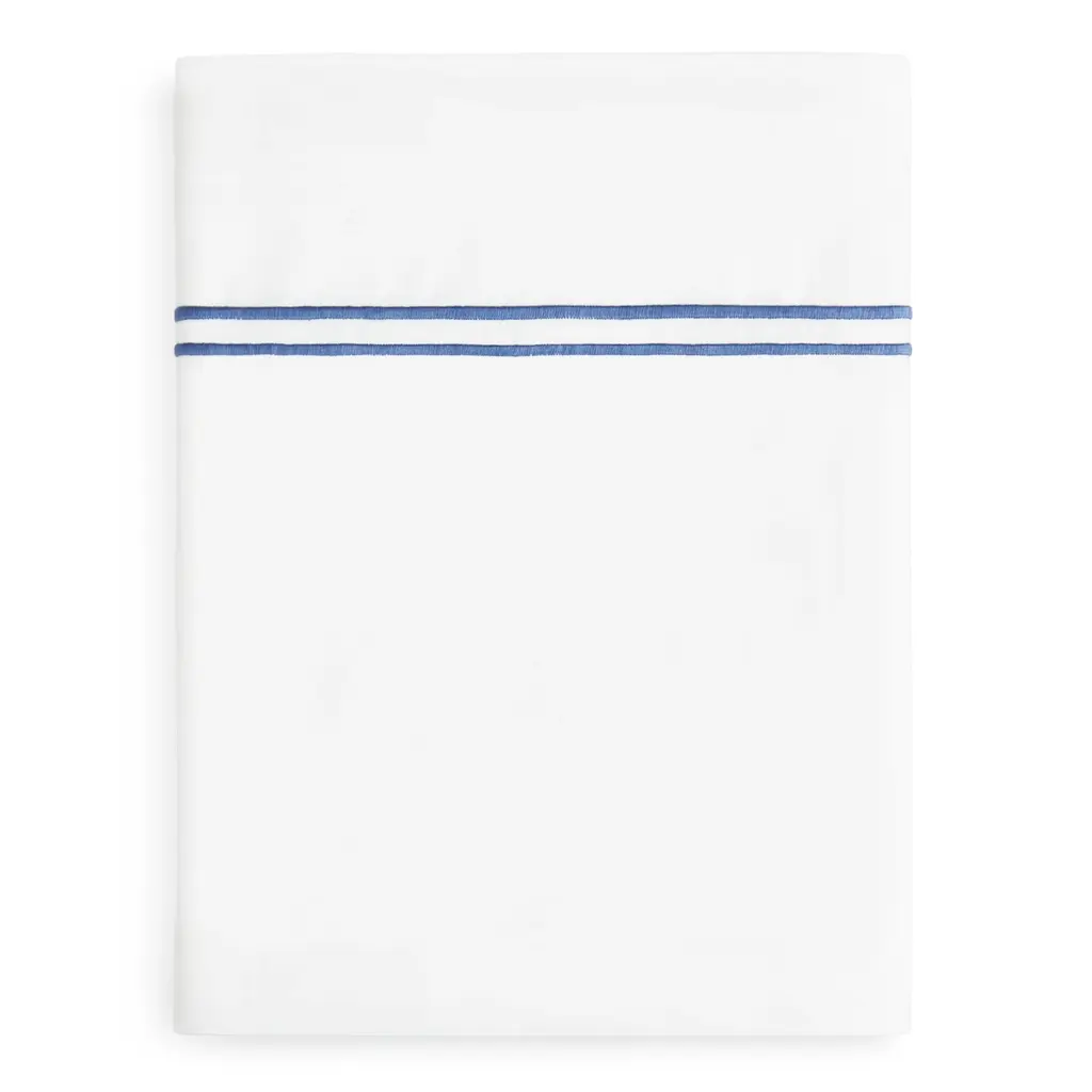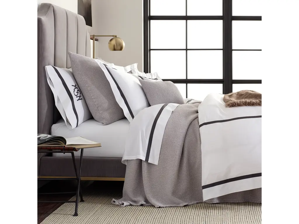 A classic bedding collection in crisp, white 600-thread count Egyptian cotton percale with a tape border in muted hues. A coordinating coverlet features an all over pearl matelasse design.