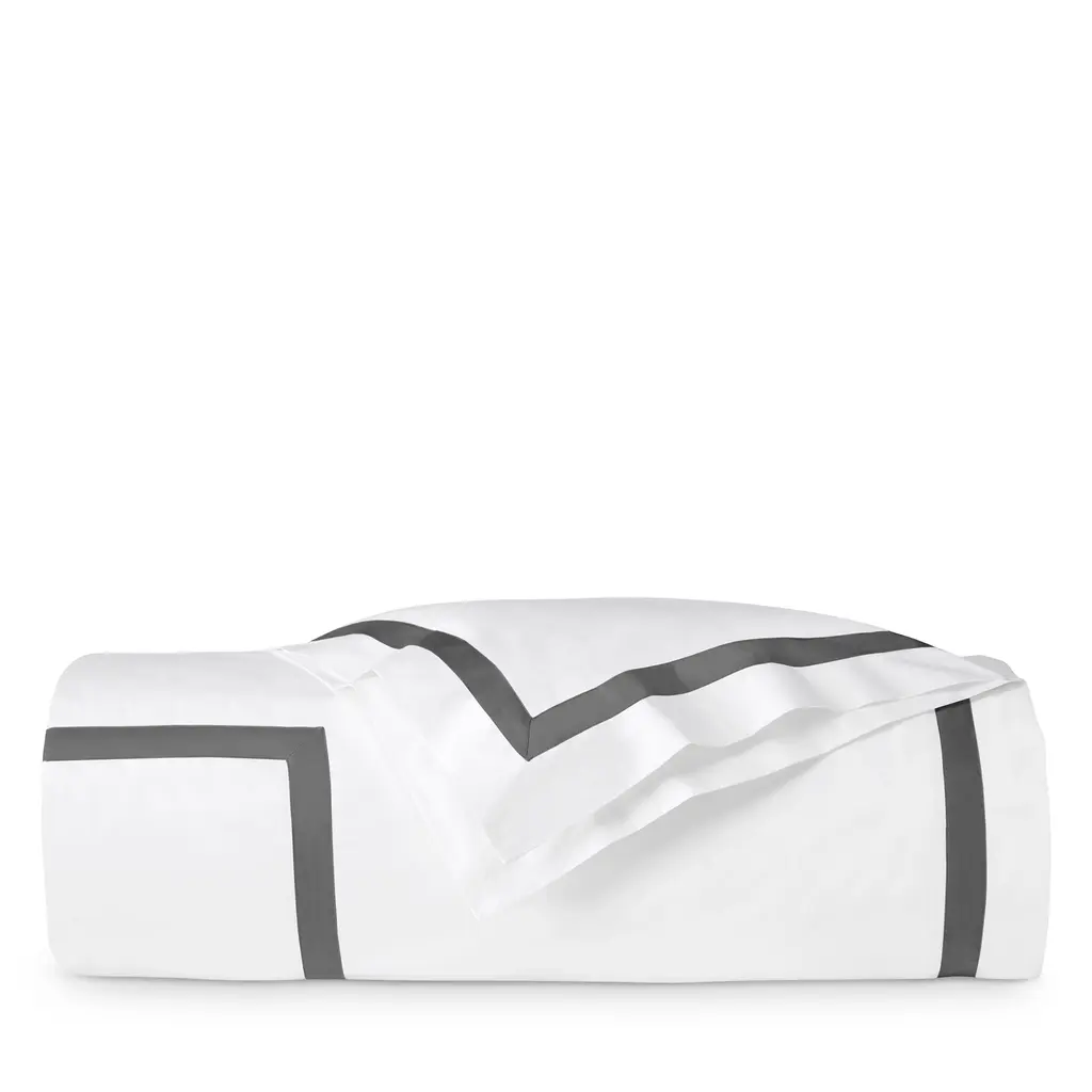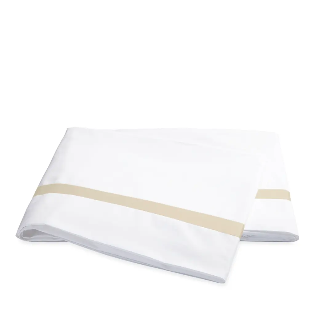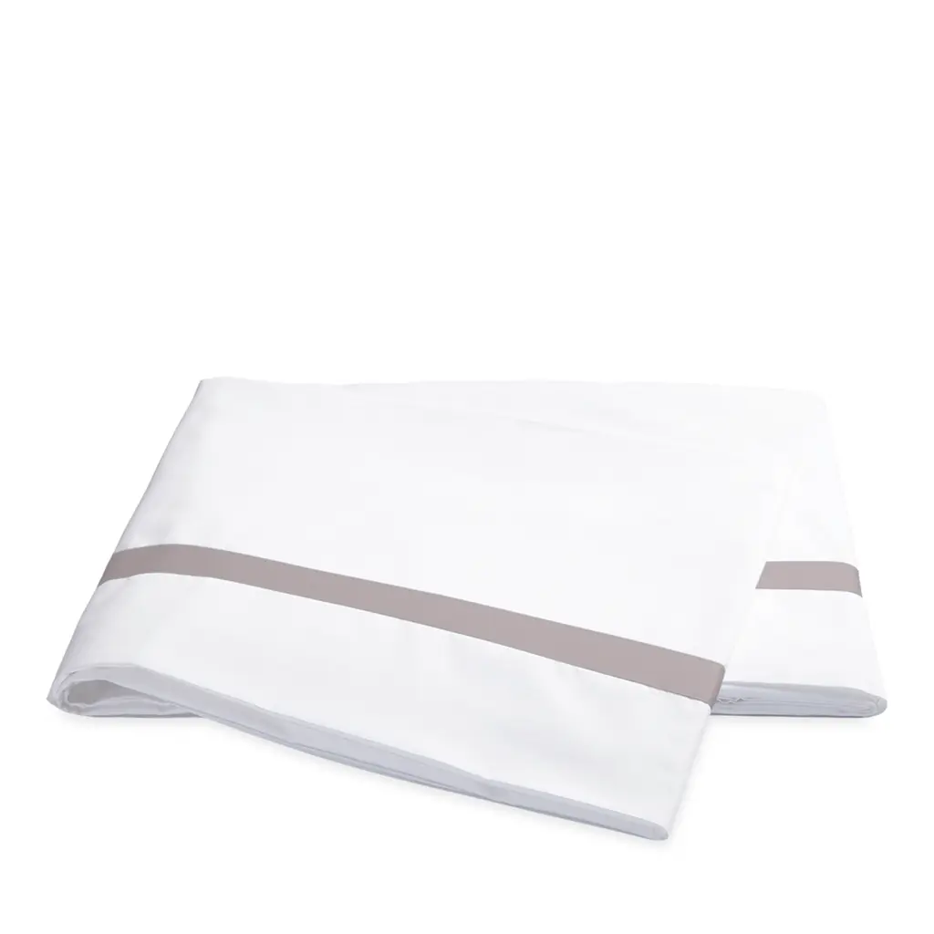 A classic bedding collection in crisp, white 600-thread count Egyptian cotton percale with a tape border in muted hues. A coordinating coverlet features an all over pearl matelasse design.
