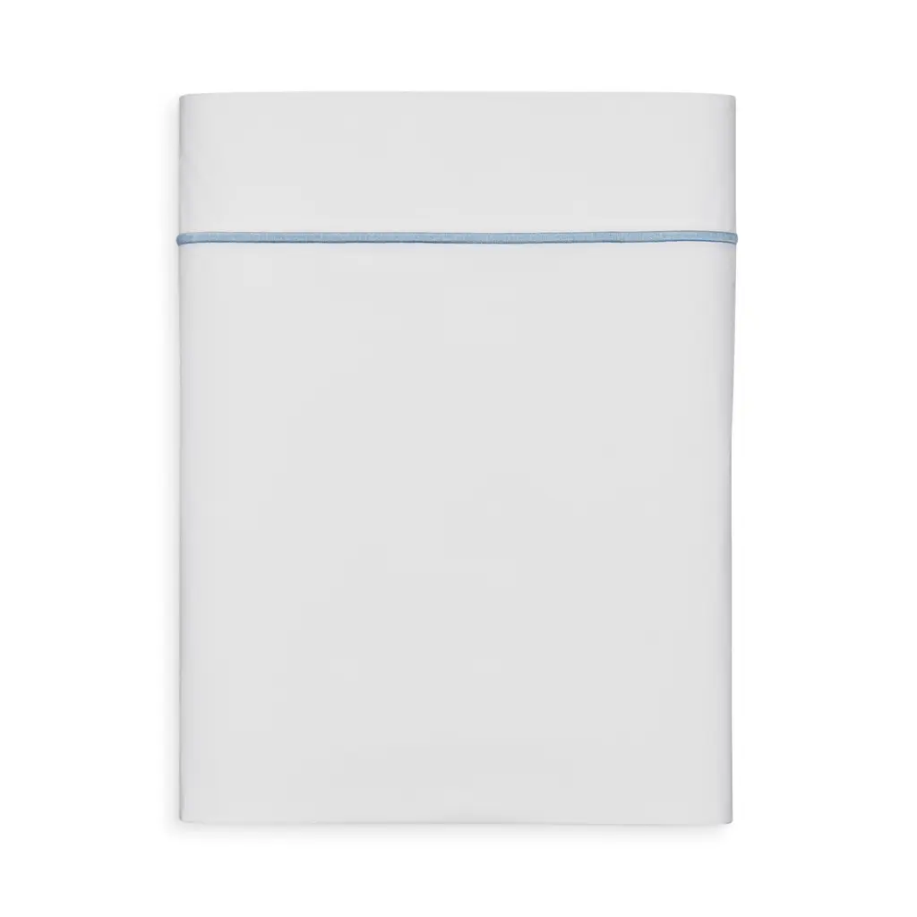 A classic bedding collection in crisp, white 600-thread count Egyptian cotton percale with a tape border in muted hues. A coordinating coverlet features an all over pearl matelasse design.