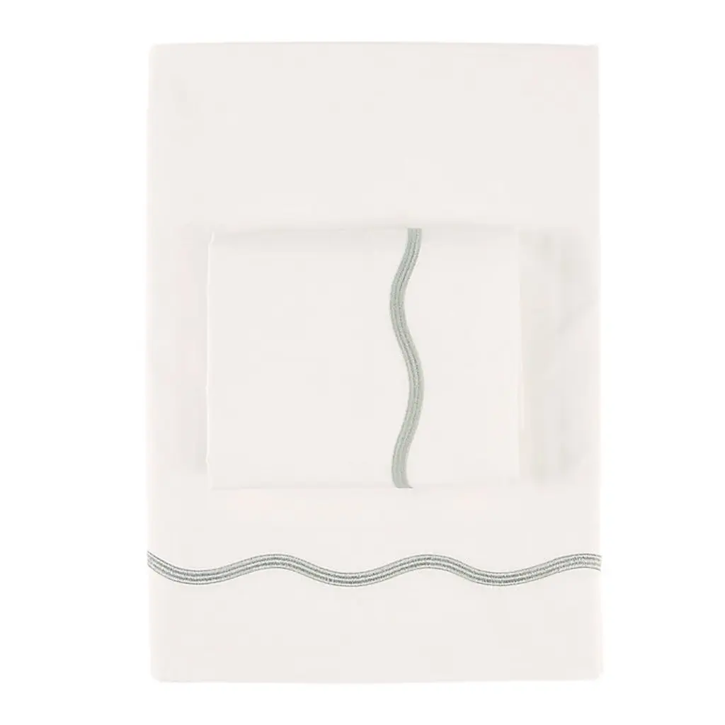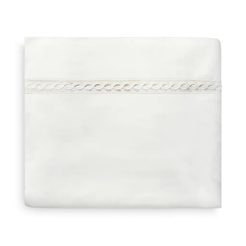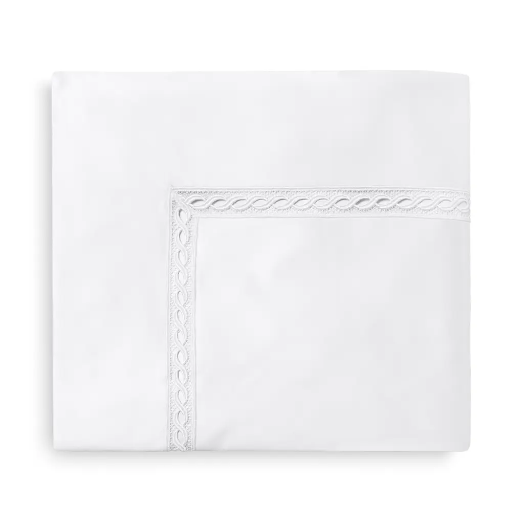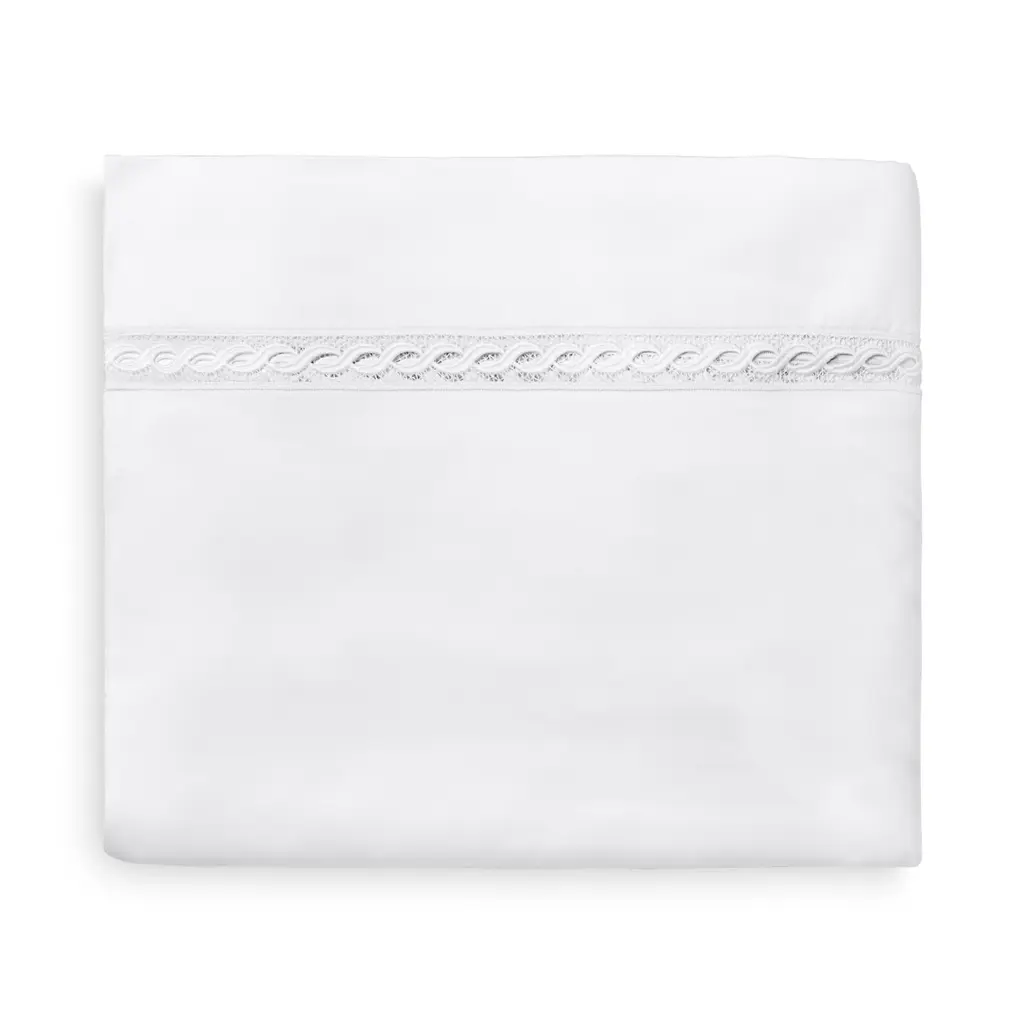 Millesimo Bedding Collection by SFERRA is polished sateen that is supple, luminous, and soft, finished with a lace inset border in a chain motif.