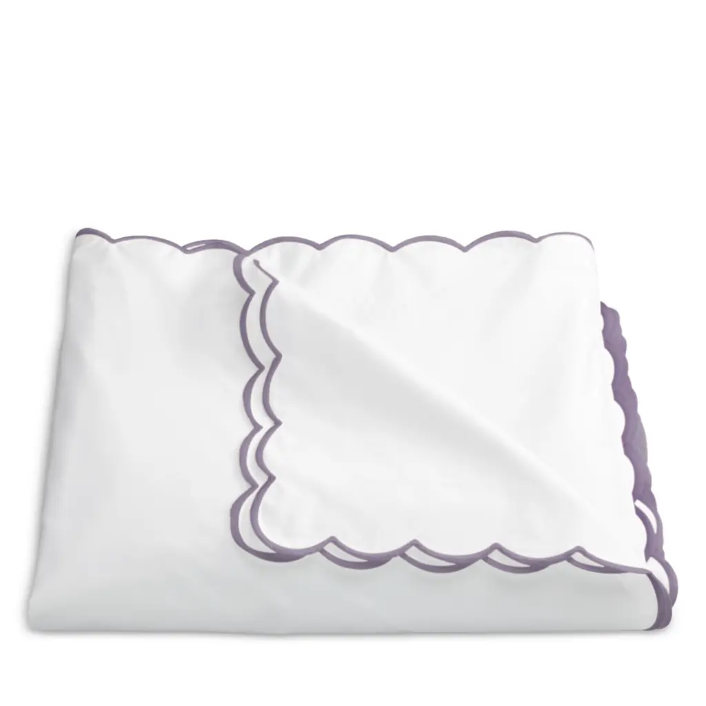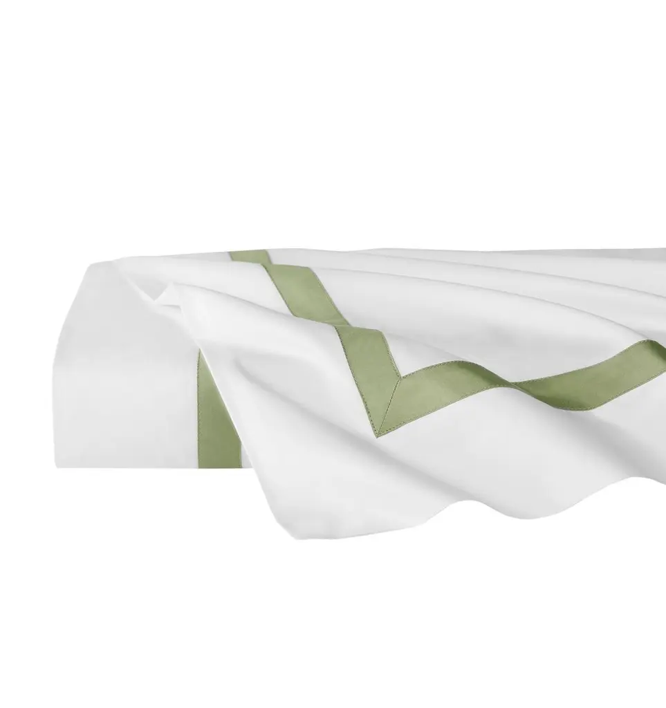 A contrasting double ribbon appliqué border trims this Matouk flat sheet crafted in crisp white, luxurious Egyptian cotton percale, inspired by the unique arch trim of shop awnings on Worth Avenue in Palm Beach.