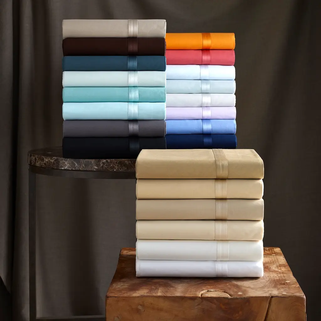 Crafted from fine Egyptian cotton, Matouk's Nocturne sheets complete an opulent or traditional space, with its classic colors and luminous sheen, accented with a tonal ribbon border.