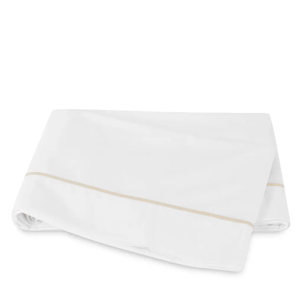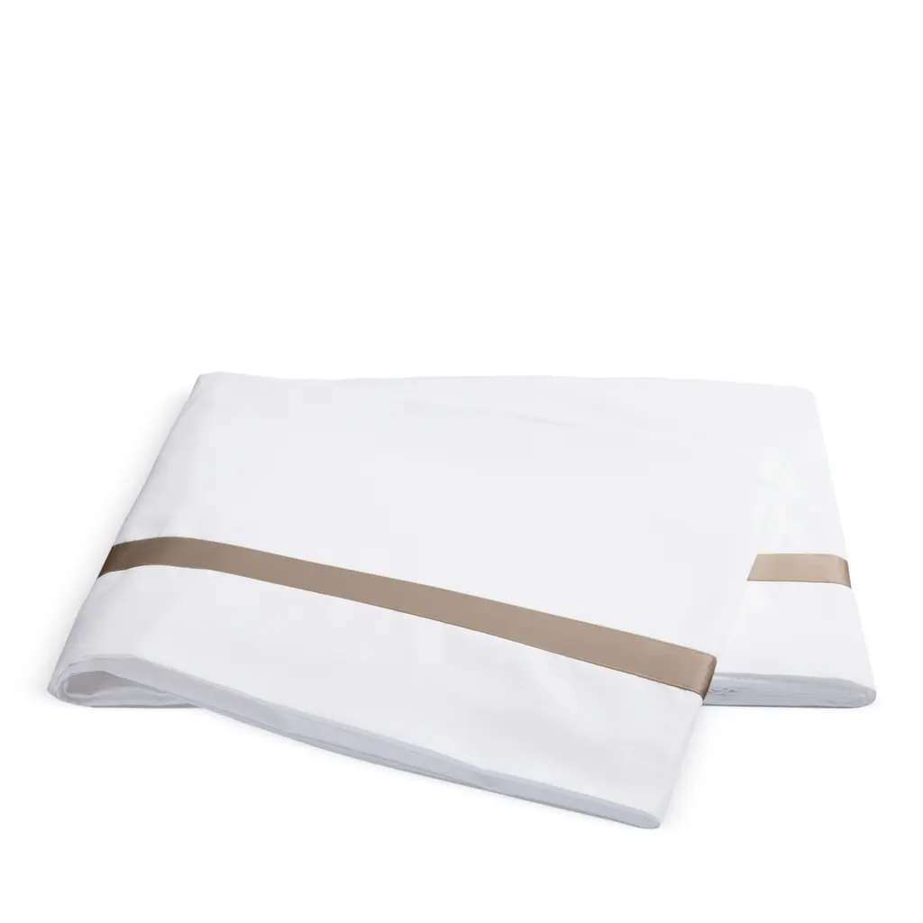 Crafted from fine Egyptian cotton, Matouk's Nocturne sheets complete an opulent or traditional space, with its classic colors and luminous sheen, accented with a tonal ribbon border.