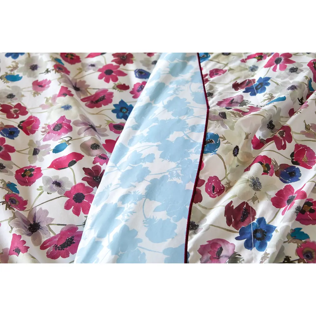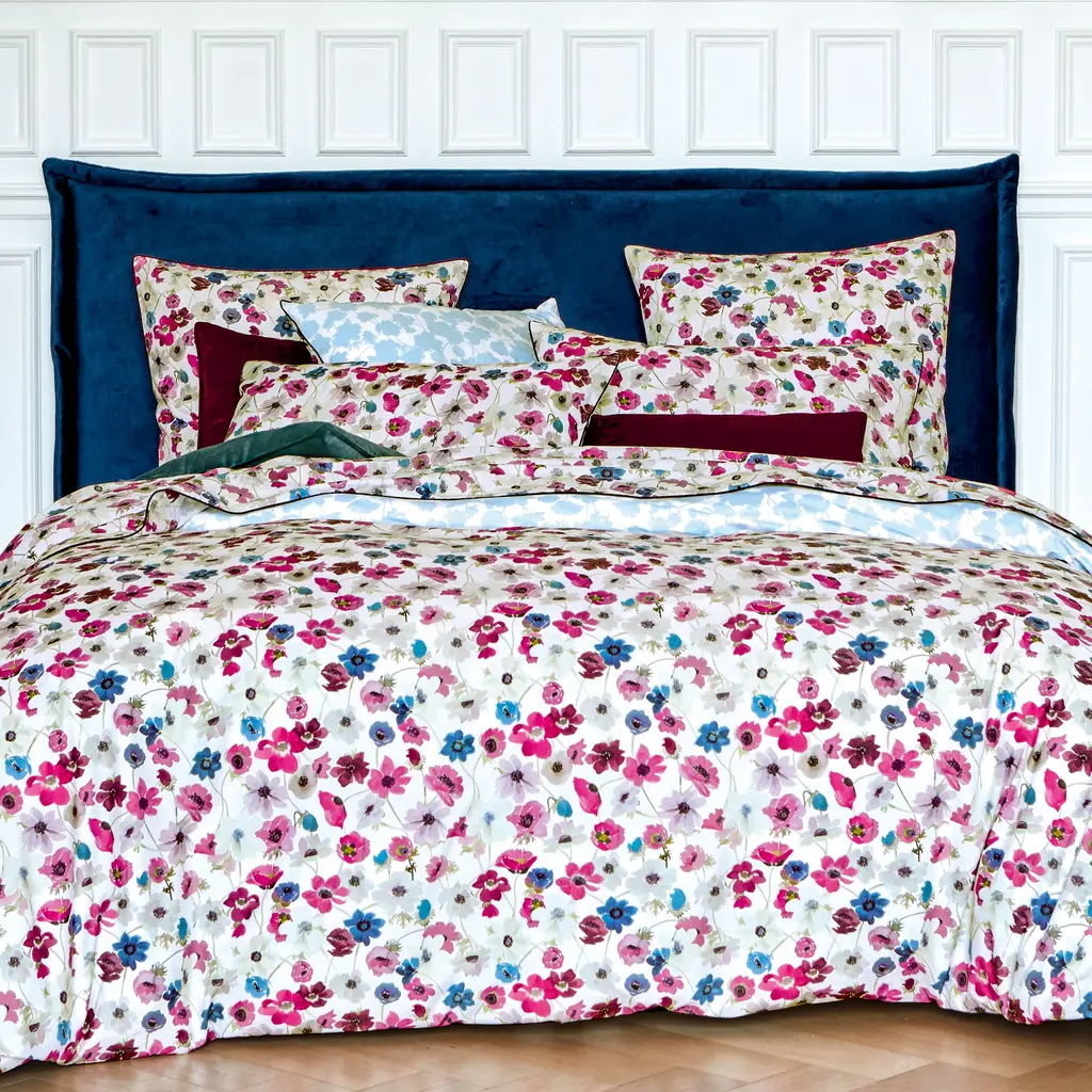 The Prairie Sheets from Anne de Solene feature a beautiful, contemporary design of multi-colored flowers in a striking color palette, coordinated with the same all-over design, but done in one color blue. Both the flower prints are done on a white ground. The multi-colored flowers look hand painted, with great depth of color. The look is assured, contemporary and beautiful.