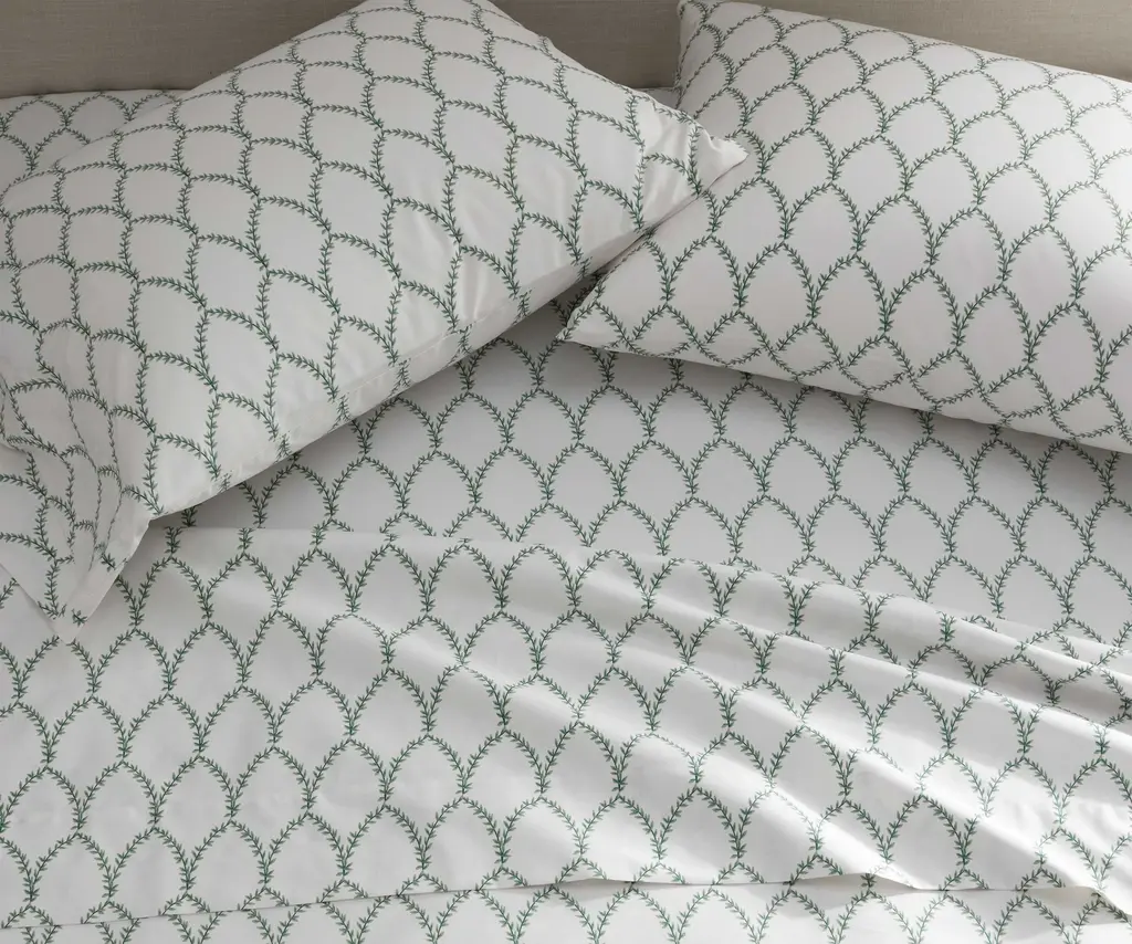 Arbors of delicate leaves arc across a solid ivory ground to create a pattern with a classic feel. Offered in your choice of three colorways, gold, blue, and sage, these sheets were created to layer with our other printed sateen bedding collections and coordinating Matelasse (sold separately). Crafted of buttery-soft and breathable sateen, this bedding collection has a subtle sheen and beautiful drape that's perfect for all-season comfort. Part of the Rifle Paper Co. x The Company Store collection.