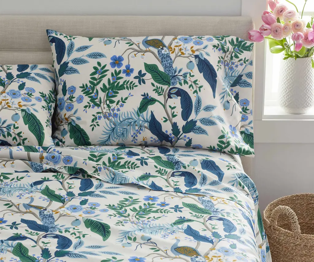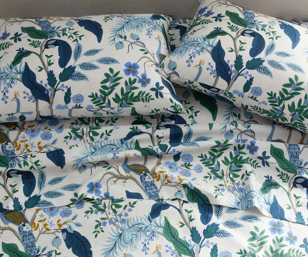 This Peacock print flat sheet features a sophisticated scene of birds perched among winding branches and blooming flowers, with a tranquil color palette of blue, aqua, green, gold, and white. Coordinate it with other pieces in the Peacock collection or layer it with our Laurel Sateen bedding (sold separately). Crafted of buttery-soft and breathable sateen, this bedding collection has a subtle sheen that's perfect for all-season comfort. Rifle Paper Co.'s hand-painted designs of floral blooms and bold colors bring beauty to your everyday. Part of our Rifle Paper Co. x The Company Store collection.