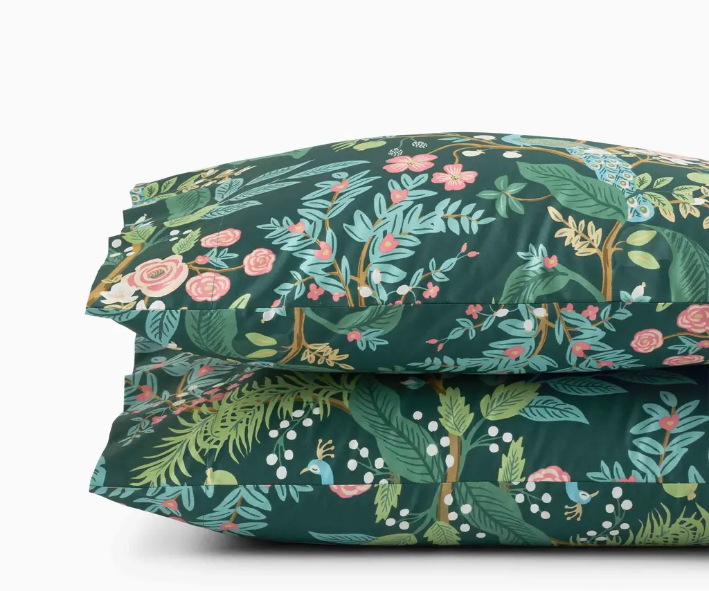 Sheets featuring a sophisticated scene of peacocks perched among winding branches and blooming flowers, designed to pair with the coordinating duvet cover, comforter , and accent pillows. Crafted of buttery-soft and breathable sateen, this bedding collection has a subtle sheen and beautiful drape that's perfect for all-season comfort. Part of the Rifle Paper Co. x The Company Store collection.