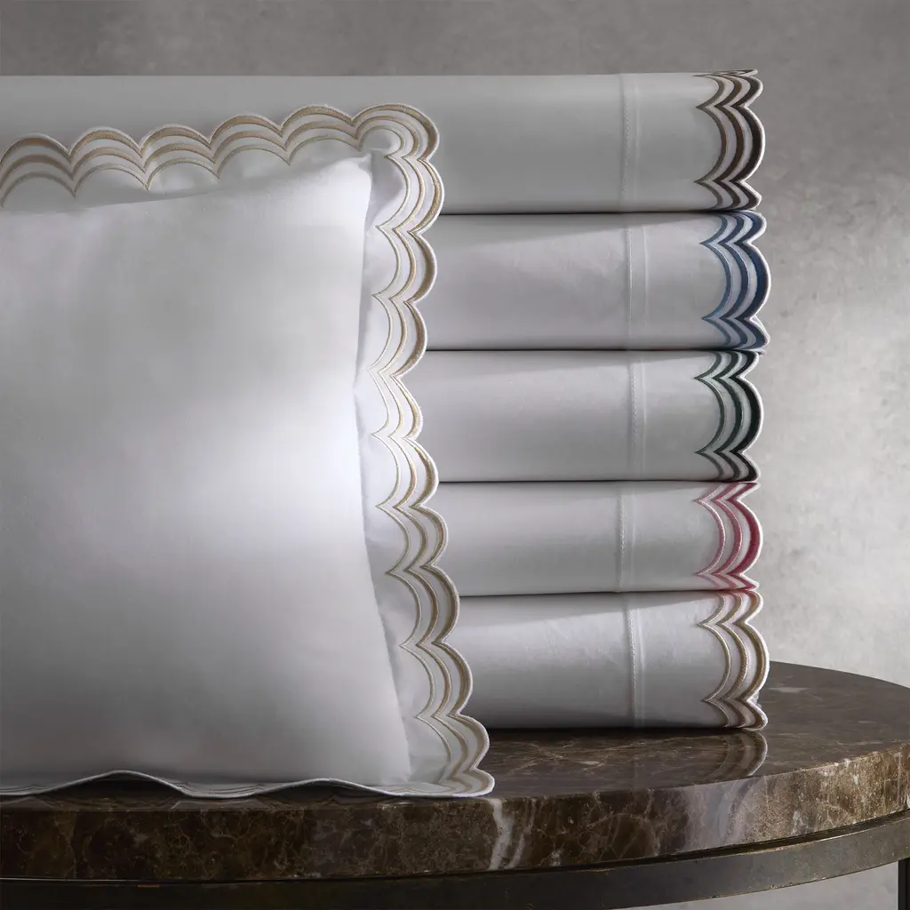 Stella from Matouk is a stylish embroidered collection featuring three lines in tonal hues curved across the flange of crisp Milano percale sheeting. It has an Art-Deco feel that's artistically inspired, and its range of color combinations is designed to delight the senses.