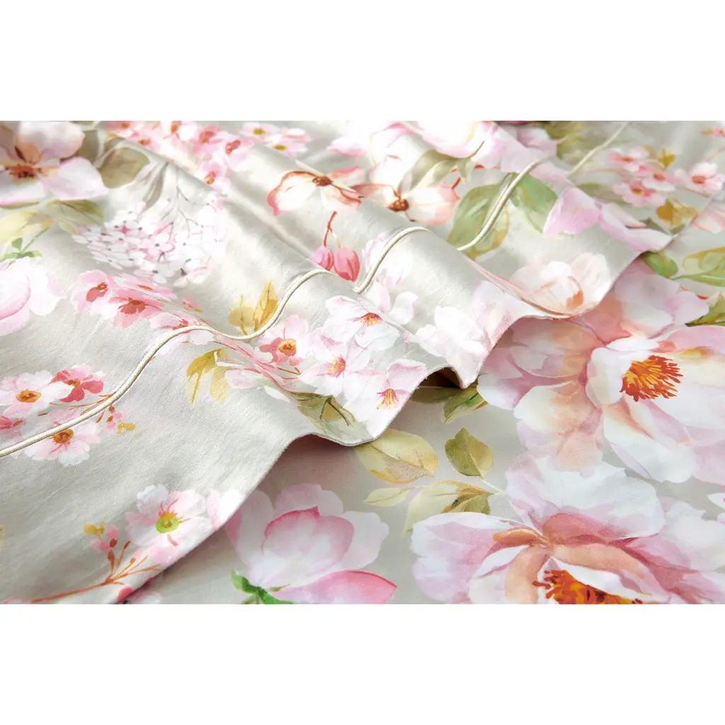 Voyageuse is a sophisticated, artistic printed design of roses and cherry blossom on a sage green ground, coordinated with a luxurious palmette print.