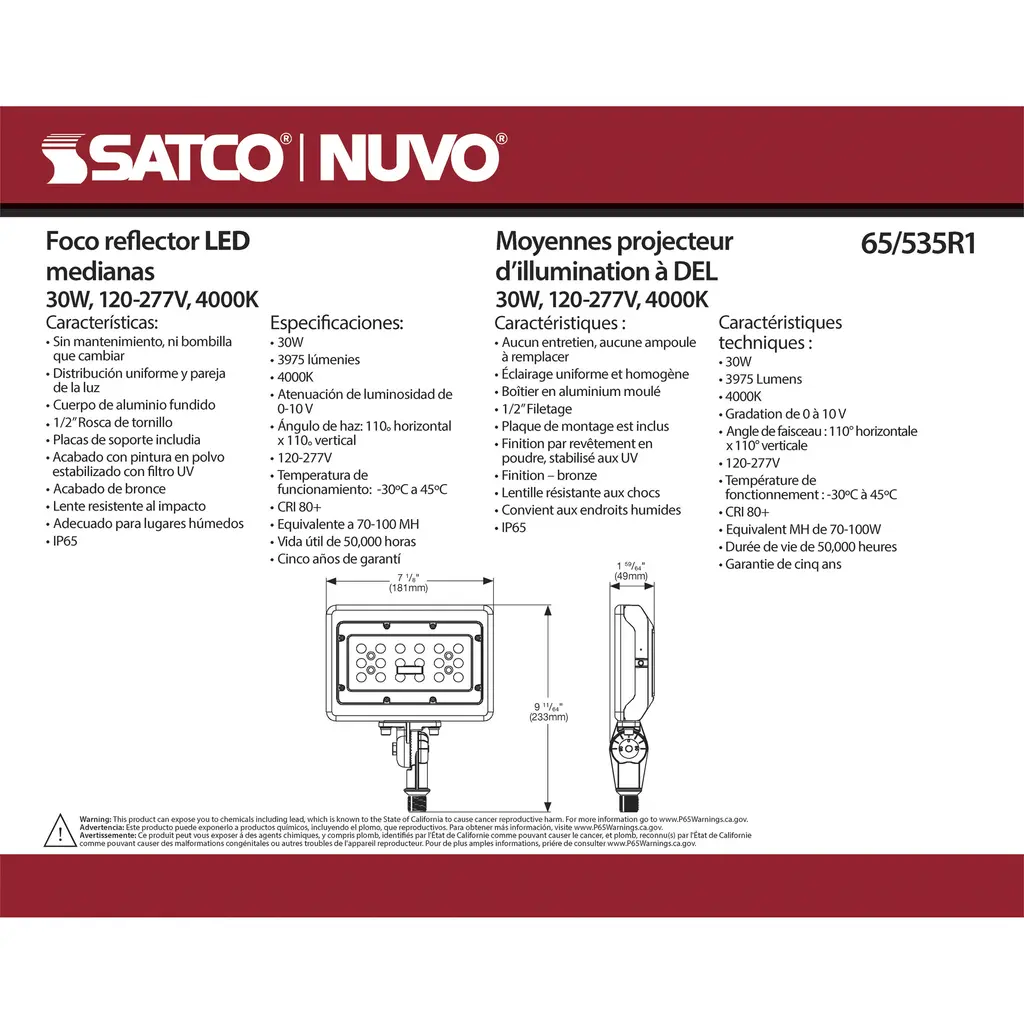 LED Medium Flood Light - 30W - 4000K - Bronze Finish - 100V-277V - Dimmable
