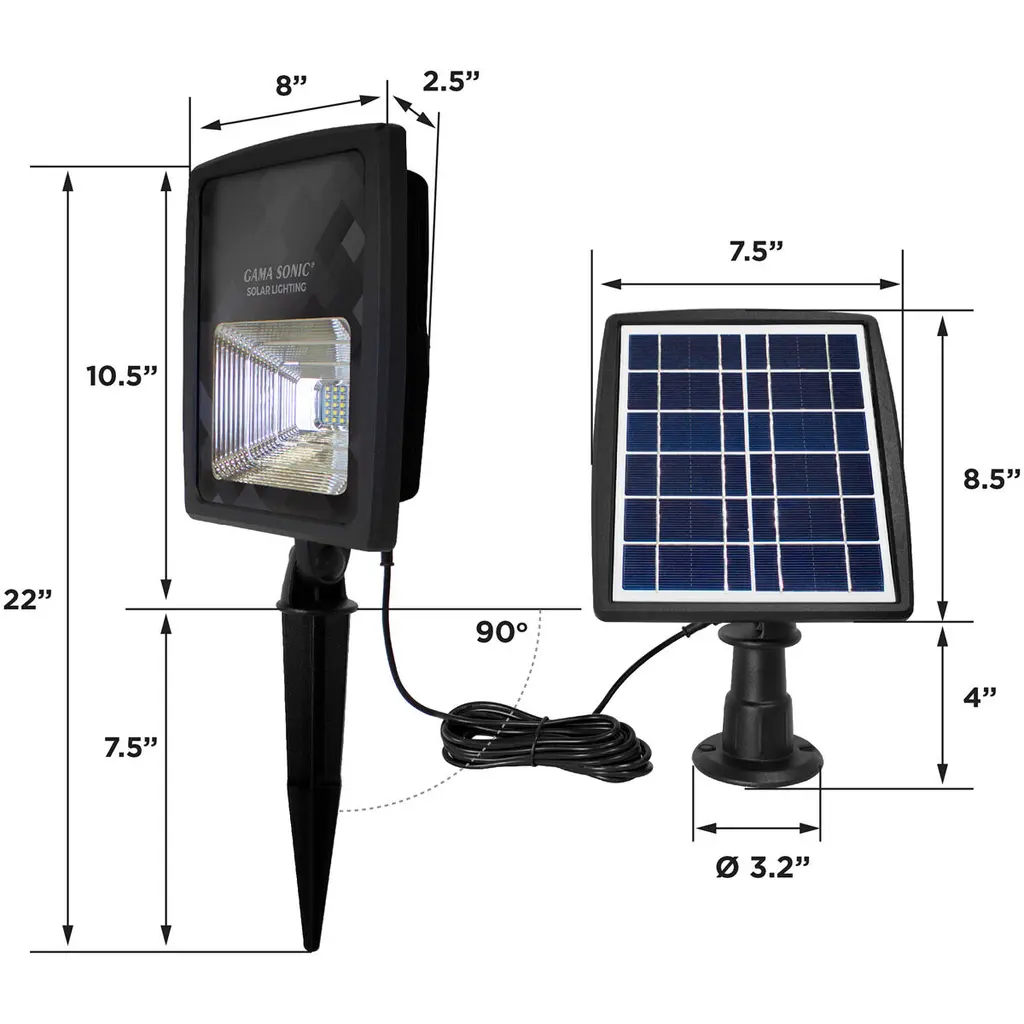 The Gama Sonic Dual Color Solar Flood Light with dual color options of warm-white and bright-white LEDs is a cost and energy-efficient power source solution intended to illuminate residential landscape statuary, foliage, flag poles, and the exterior of homes or house numbers. Installation takes minutes and no electrical wiring is required, just place it in a spot with ample direct sunshine and let the sun do the rest. At dusk, these LED Solar Flood Lights will automatically illuminate 250 Lumens for up to 20 hours on a full battery. With 4 mounting options, 1. Stake the solar light into the ground with the solar panel attached, 2. Stake the solar light and the detached solar panel into the ground, 3. On a flat surface with attached panel, and 4. On a flat surface with a detached solar panel staked into the groundDesigned with an outdoor weatherproof IP65-resistant cast aluminum enclosure, this solar-powered utility light has a beam-spread distance of approximately 10 ft. in length and a height of 68 ft. The versatile solar panel has the capability to be attached either to the light fixture or detached and placed up 12 ft. away with the included extension cord for maximum sun exposure. The monocrystalline solar panel is protected by weather-resistant, cleanable tempered glass that helps ensure long-lasting reliability.