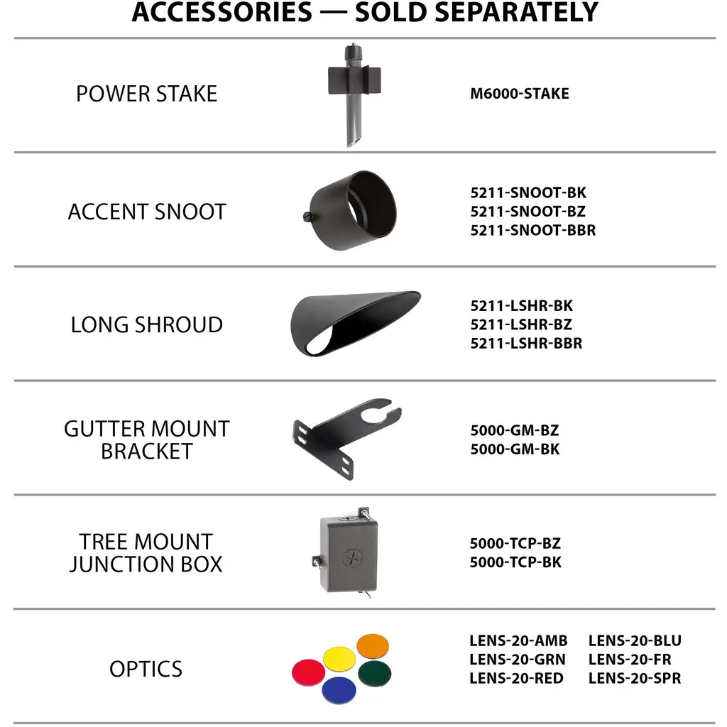 Function meets durability with the WAC Landscape Lighting LED accent light, available in 12V or 120V in a wide range of color temperature options. A simple twist of the fixture at indexed intervals (15, 30, 45, 60 degree indexes) allows continuous beam angle adjustment from flood to spot while a mechanical dial at the base provides smooth integral brightness control. One sku fits most applications, eliminating the need to choose from dozens of light bulbs with varying beam angles and light outputs when compared with traditional landscape accent lights. This accent light is factory sealed and water tight with an IP66 rating for protection against high-pressure water jets and outdoor elements. A detachable shroud is included along with a 9in mounting spike for 12V fixtures (120V fixtures require Sku M6000-STAKE, power stake sold separately). Includes a 3ft lead wire and two gel filled direct burial wire nuts. Casted using a special k-alloy aluminum that is engineered to withstand the most challenging environments over time. Solid brass coated in bronze (-BBR finish) is available for enhanced protection against corrosive elements and is recommended for use in coastal or marine environments. A magnetic or electronic power supply is required (sold separately) for 12V fixtures. A variety of accessories are sold separately for additional mounting and glare control options.