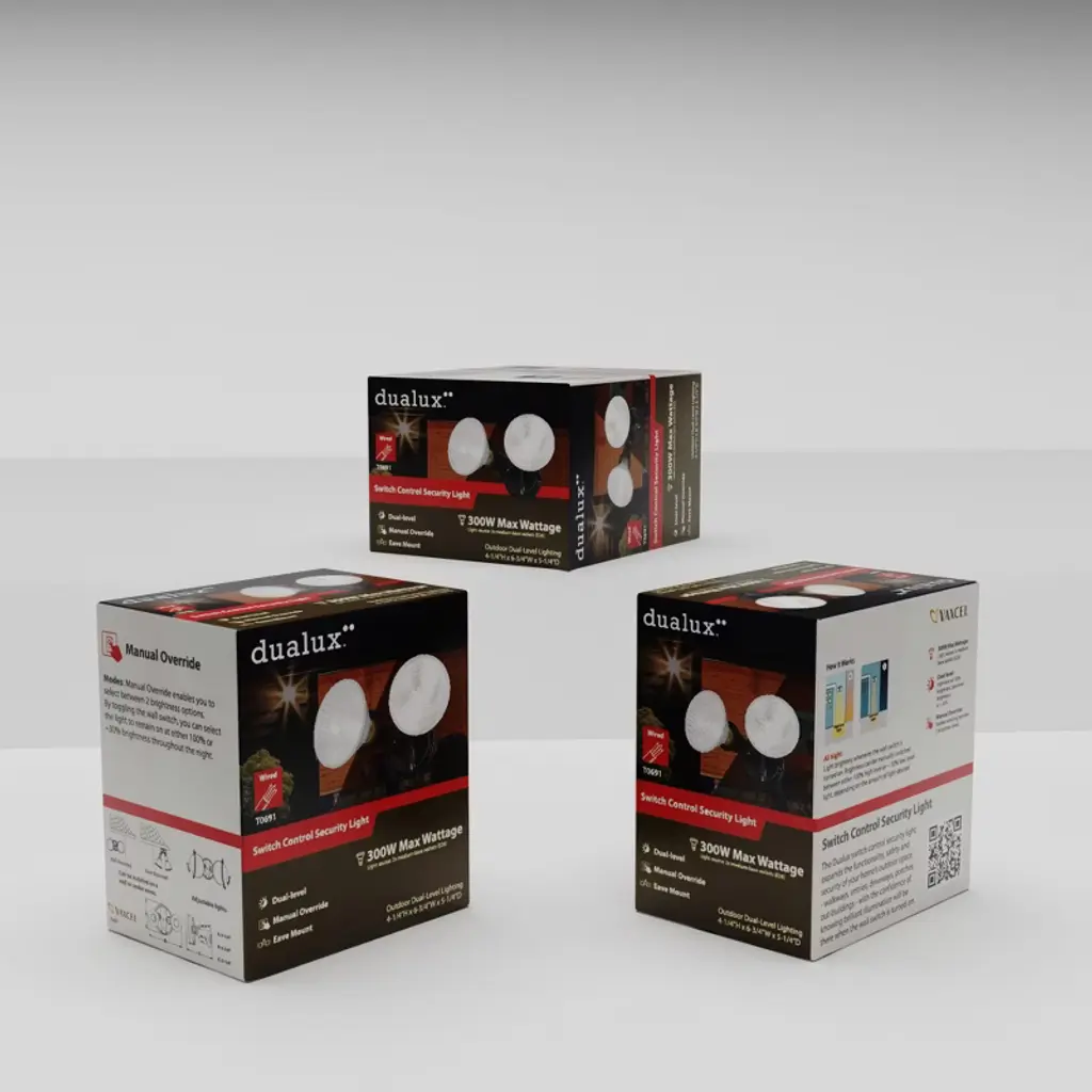 This 2-light outdoor security light expands the functionality, safety and security of your home's outdoor spaces. Adjustable rotating light heads allow you to direct light where it is needed most. Dual-level brightness functionality is controlled through your wall switch (not included). Turn the wall switch off and on twice within 3 seconds for approximately 30% of full brightness. Revert back to the default 100% of full brightness by turning the wall switch off, and then on after 5 seconds. Plus there are versatile wall or eave mounting options. Enjoy the confidence of knowing brilliant illumination and reliable light is right at your fingertips.